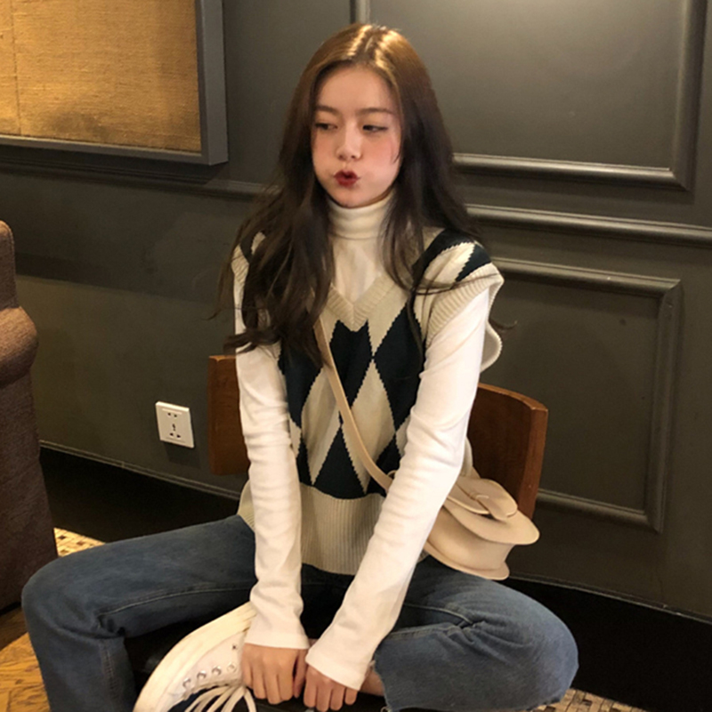 / 秋裝女2018新款拼色菱格無袖馬甲背心高領長袖打底衫修身上衣套裝