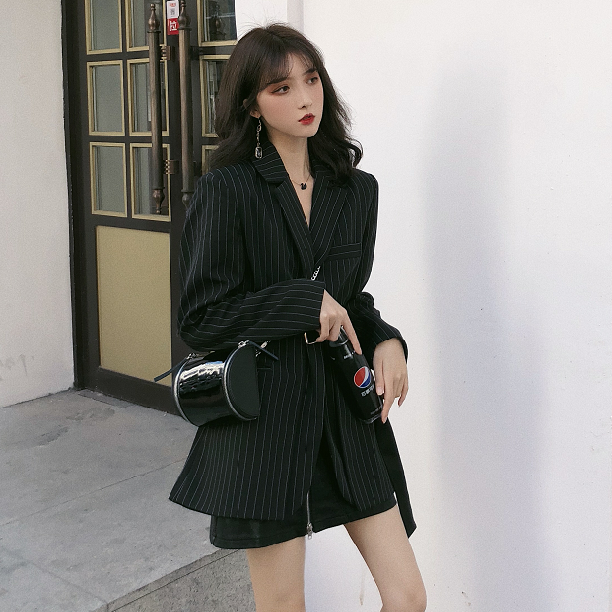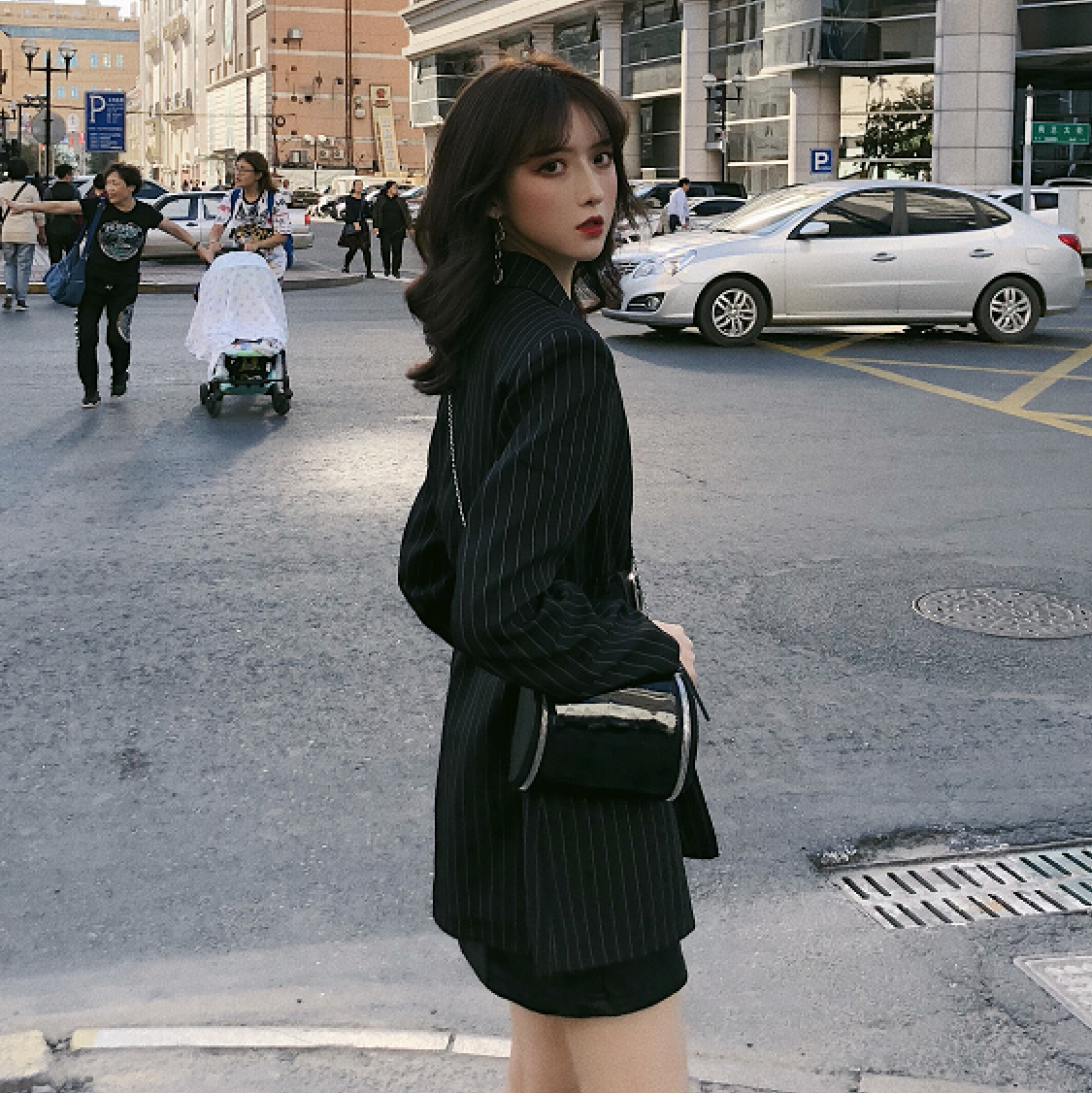 / 外套女春秋2018新款韓版時尚秋款條紋百搭修身西裝外套(帶腰帶)