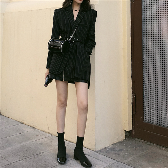 外套女春秋2018新款韓版時尚秋款條紋百搭修身西裝外套(帶腰帶)