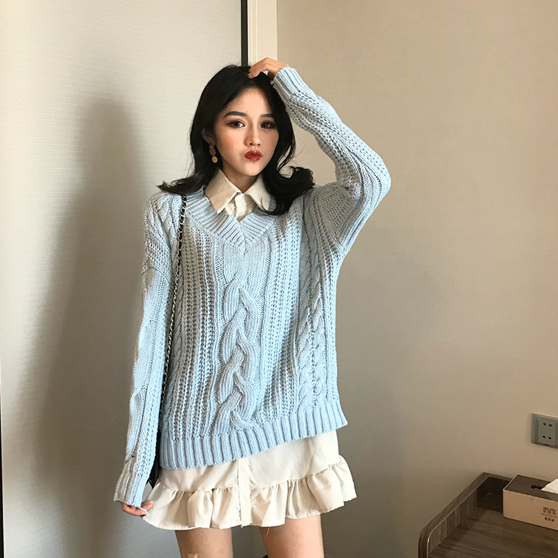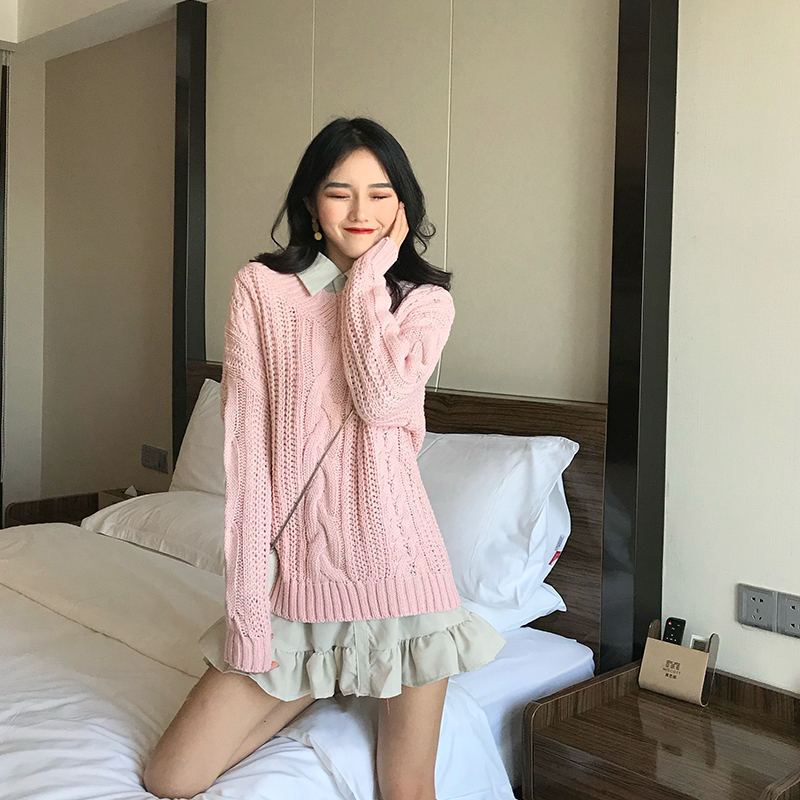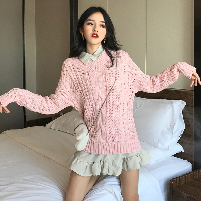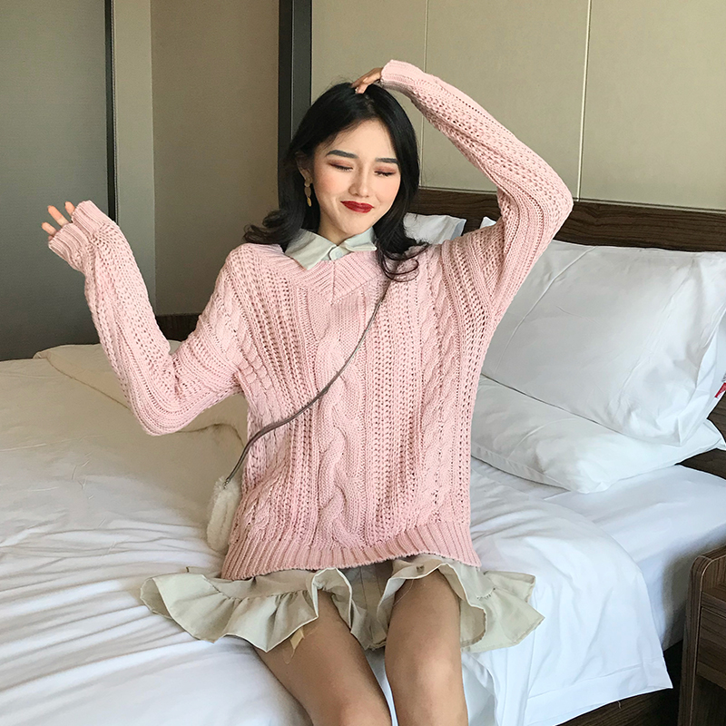 / 2018秋冬新款韓版港風時尚套裝中長款V領毛衣慵懶風chic打底襯衫