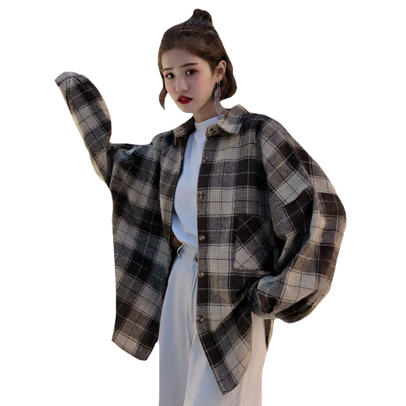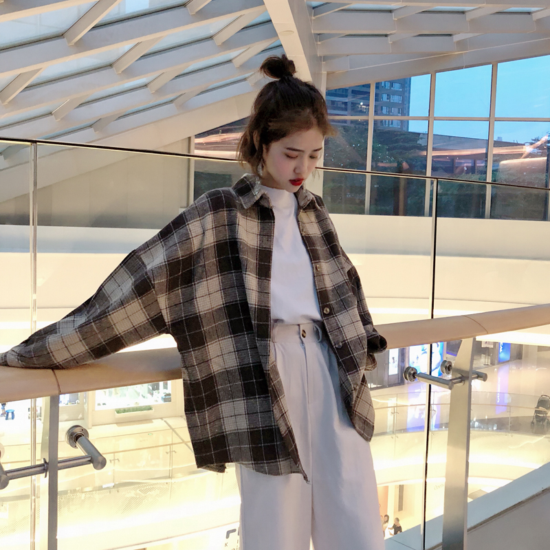 / 2018新款秋冬韓版中長款復古格子翻領襯衣寬松休閑襯衫上衣外套女