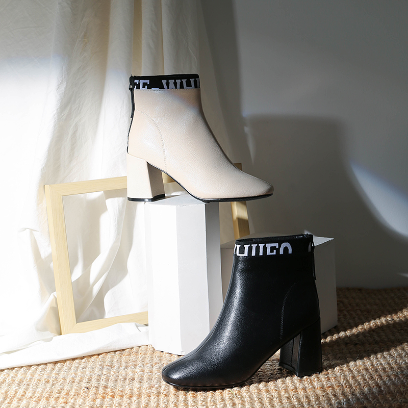 MG小象時尚高跟馬丁靴女冬季2018新款粗跟尖頭皮鞋保暖加絨短靴潮