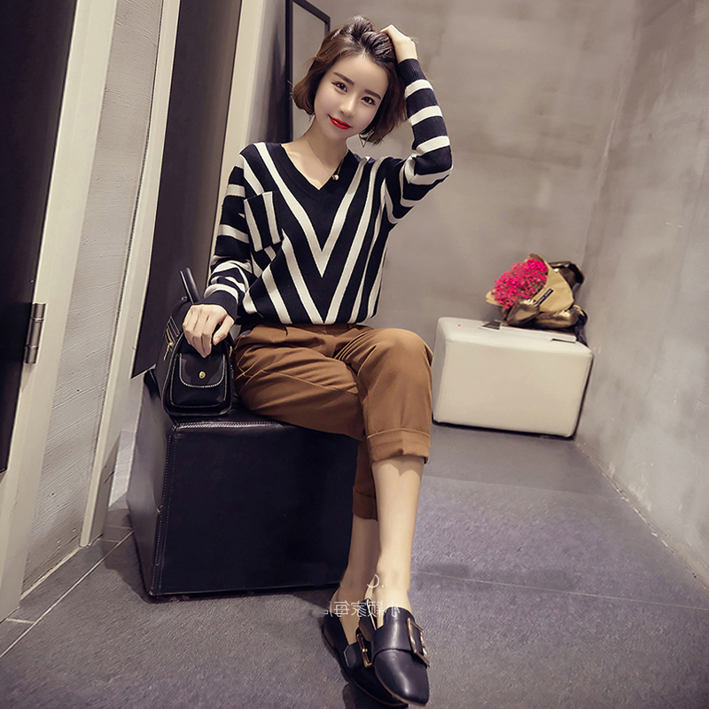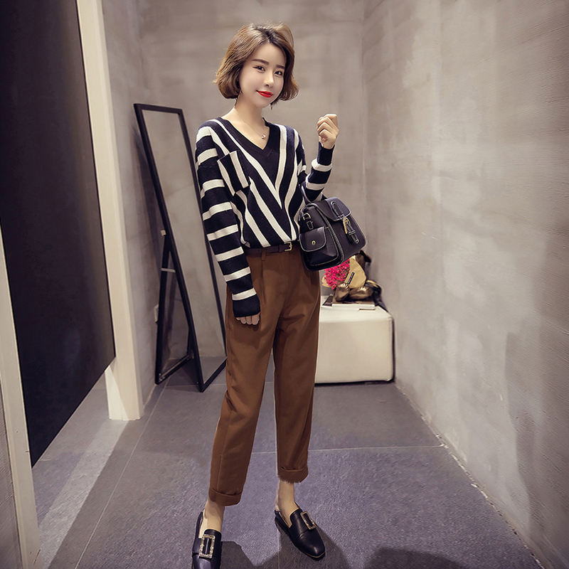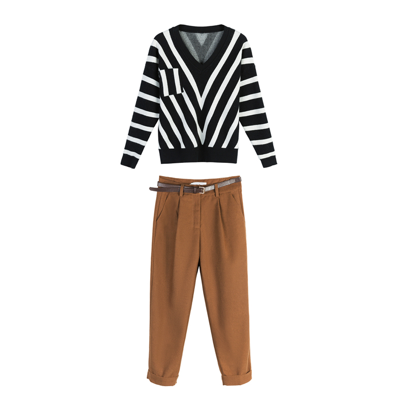 1232條紋上衣+棕色褲子