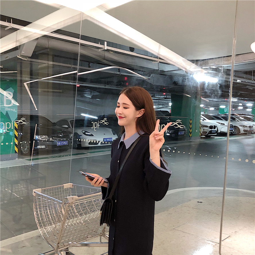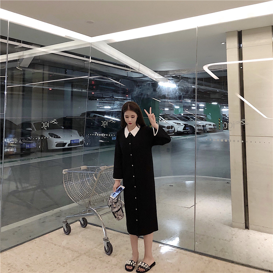 chic早秋裙子長裙女慵懶風時尚韓版撞色拼接polo領針織顯瘦連衣裙