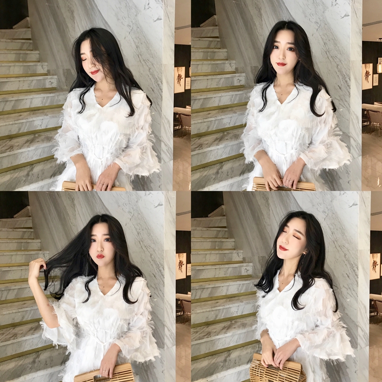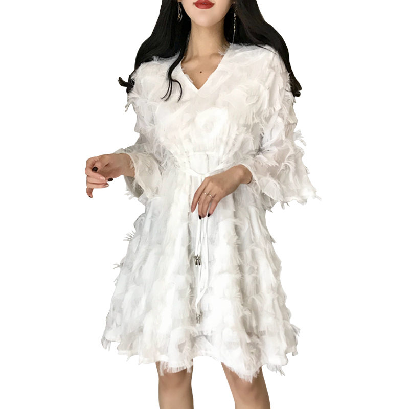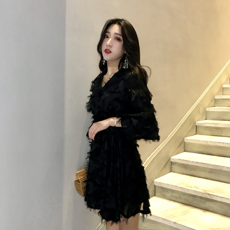 / 韓國超仙V領雪紡流蘇寬松顯瘦氣質a字娃娃裙chic小清新洋氣連衣裙