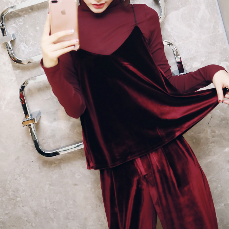 / 復古洋氣網紅絲絨三件套裝長袖上衣吊帶長褲闊腿褲秋裝女2018新款