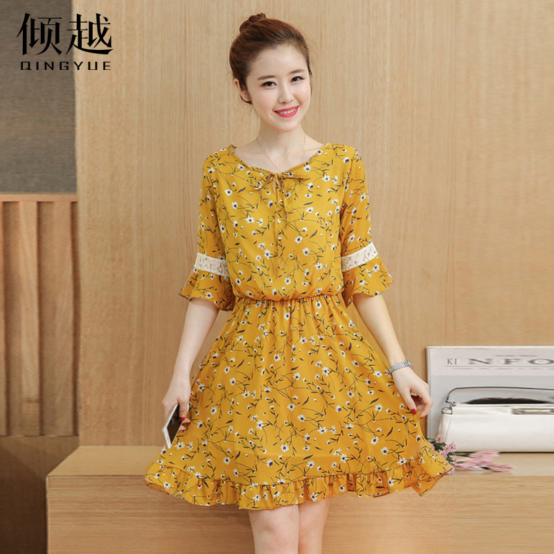 / 傾越2017春夏新款韓版女裝雪紡連衣裙顯瘦中長款魚尾裙子碎花長裙