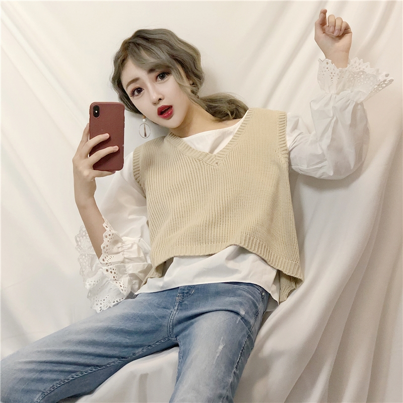 / 秋季女裝韓版V領寬松針織衫馬甲背心短款無袖毛衣上衣外套+白襯衫
