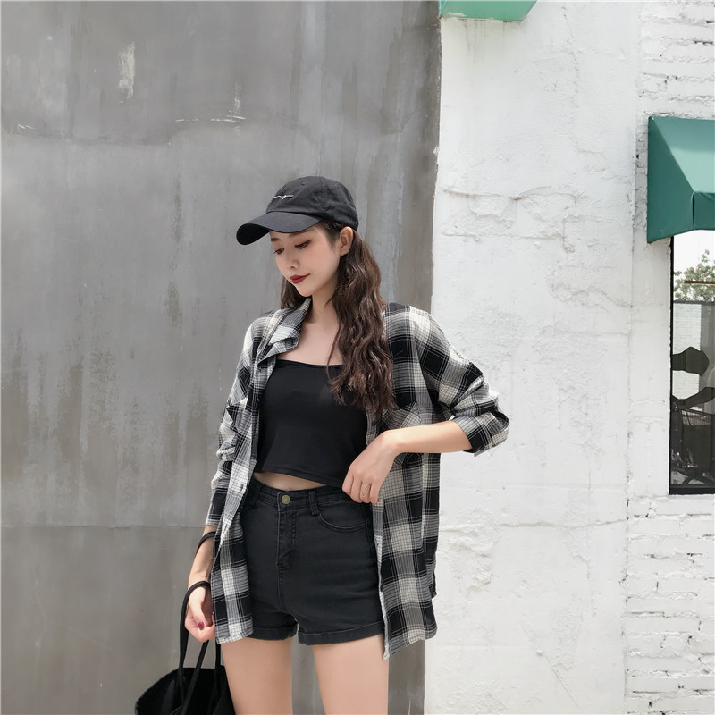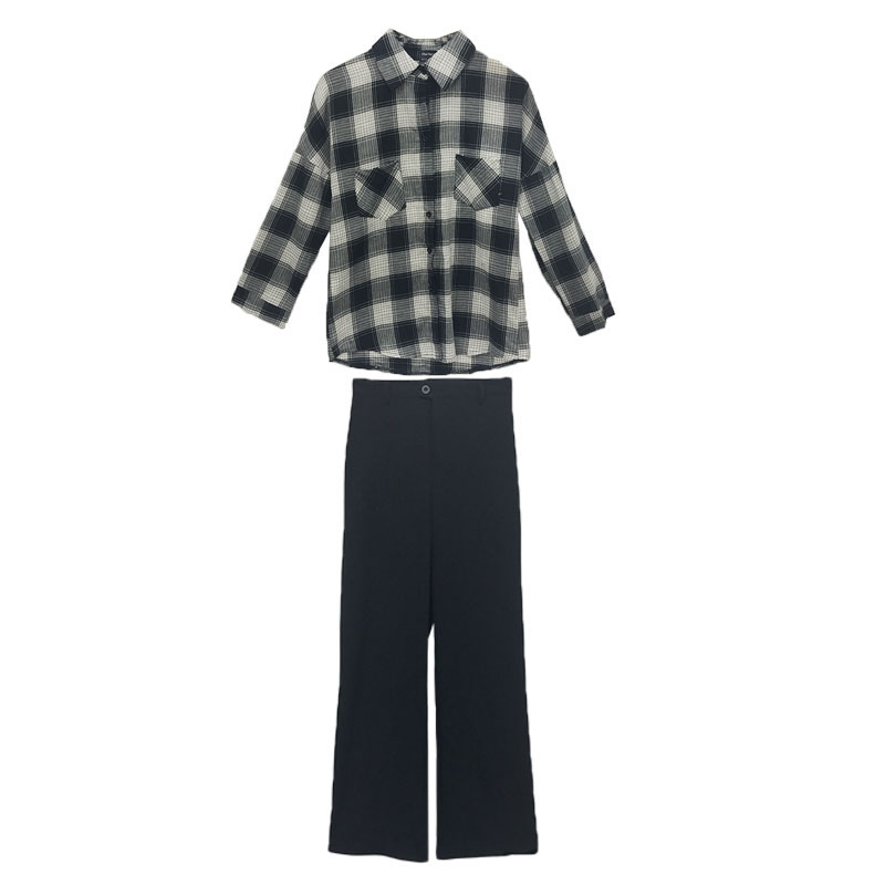 / 套裝女夏2018新款黑色格子薄款長袖襯衣+高腰顯瘦直筒闊腿拖地褲