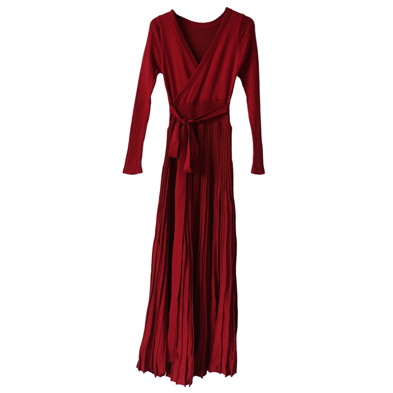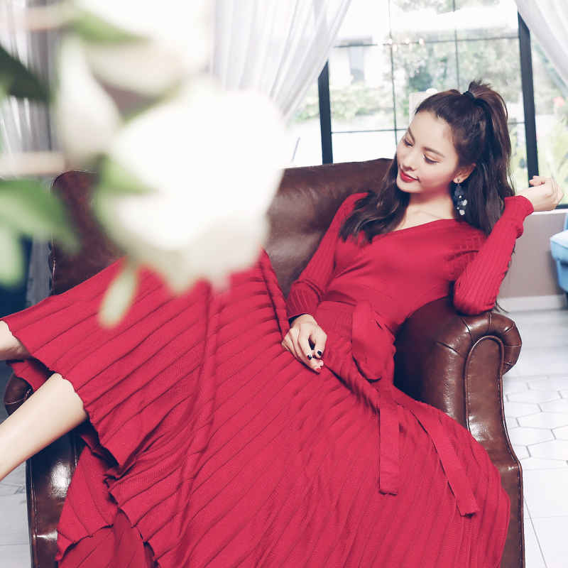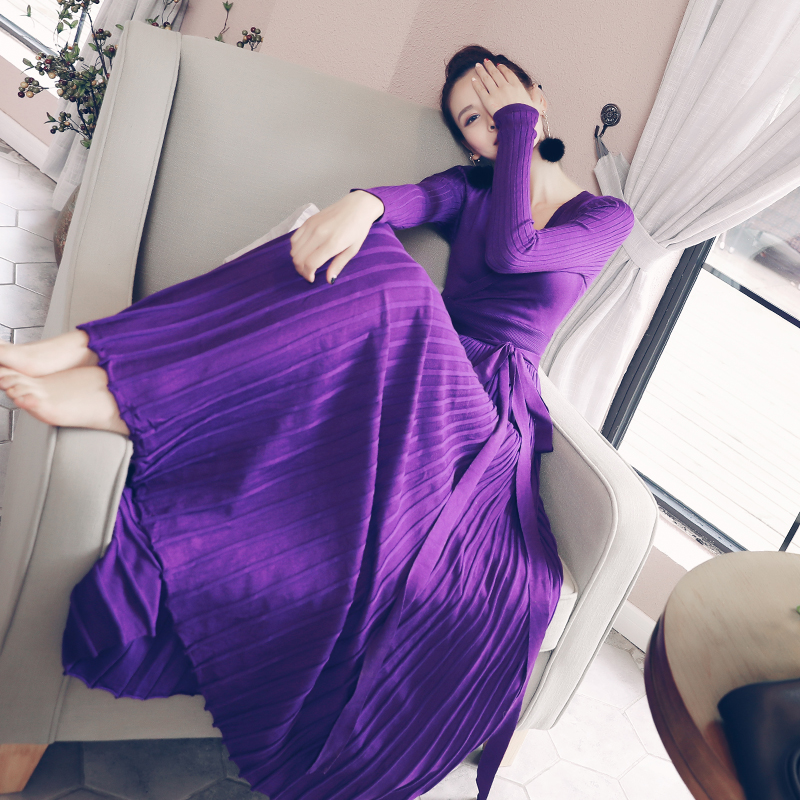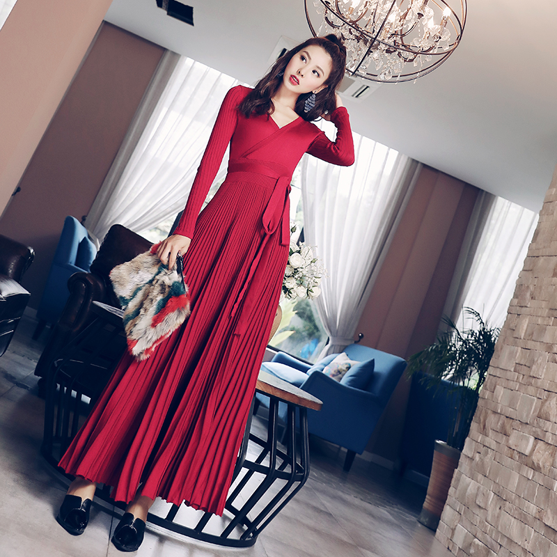 / 歐洲站新款女2018早秋裝時尚名媛氣質長款針織大擺長袖緊身連衣裙
