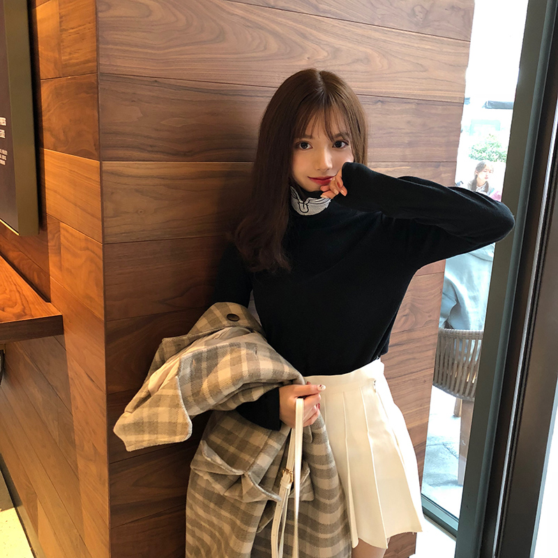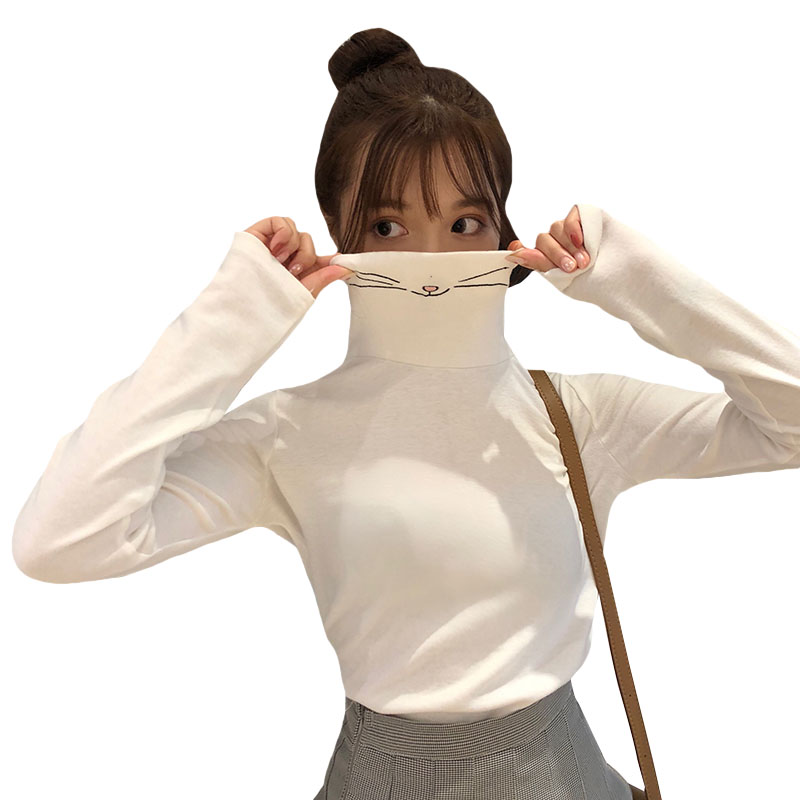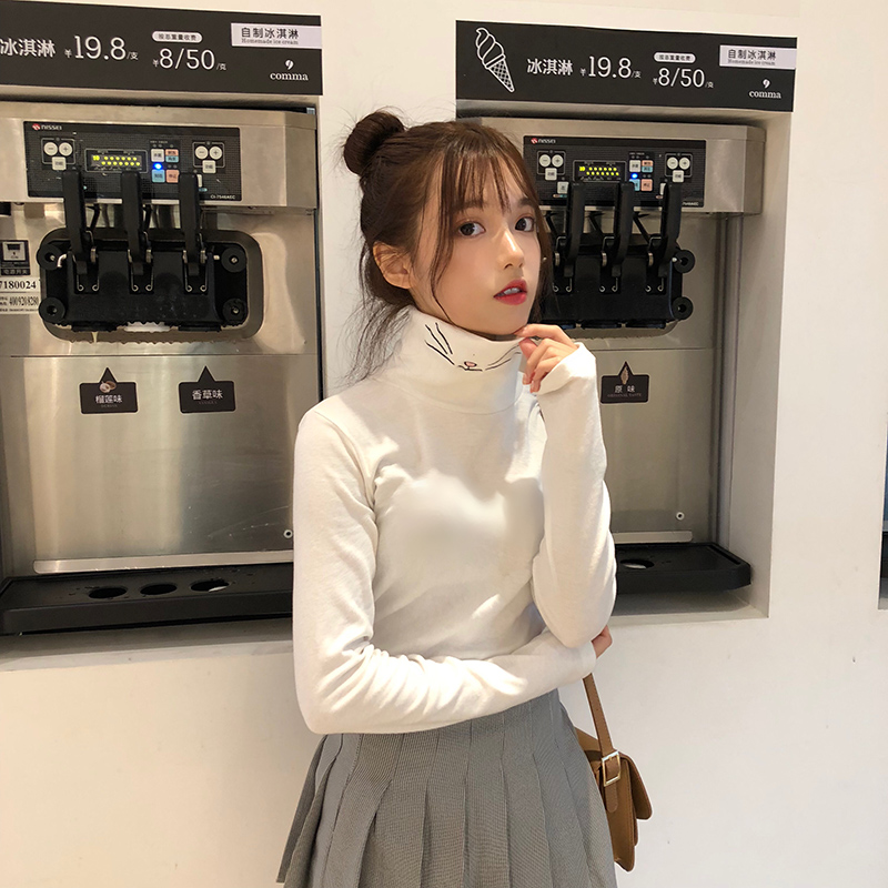 2018新款秋冬韓版修身顯瘦卡通貓咪刺繡長袖打底衫T恤上衣學生女