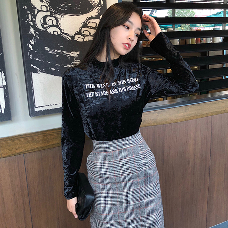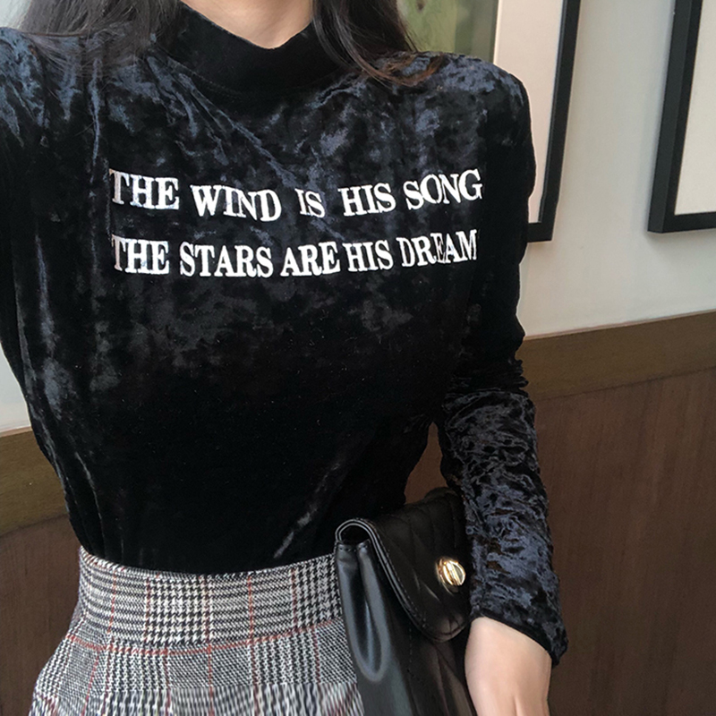 / 半高領長袖絲絨打底衫女秋冬裝2018新款韓版修身顯瘦字母T恤上衣