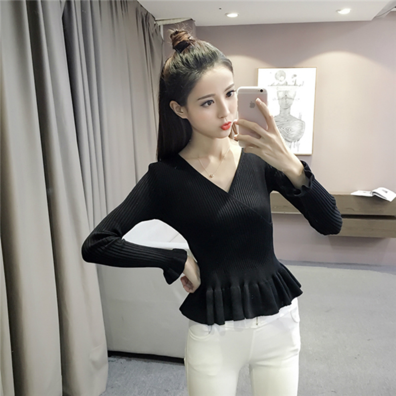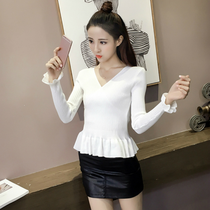 / 春季新款韓版V領套頭毛衣修身內搭長袖針織打底衫女上衣小衫