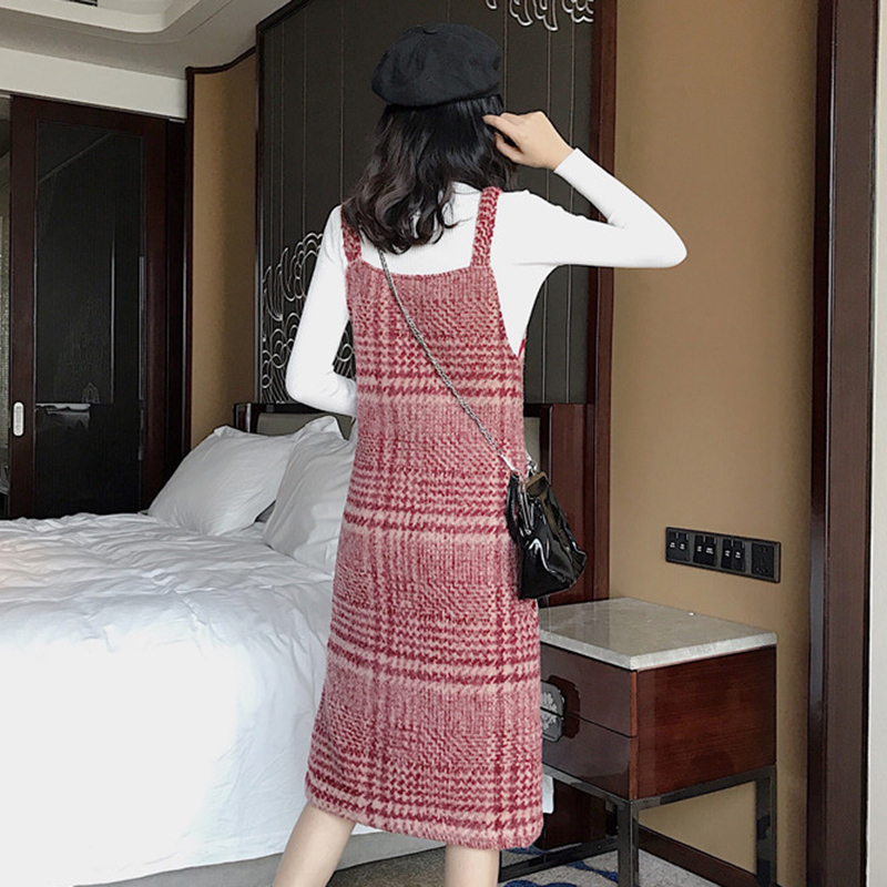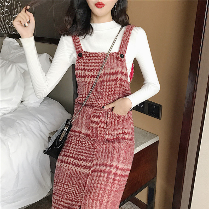/ 秋冬女裝2018新款開叉復古法式格子毛呢中長裙學生休閑背帶連衣裙
