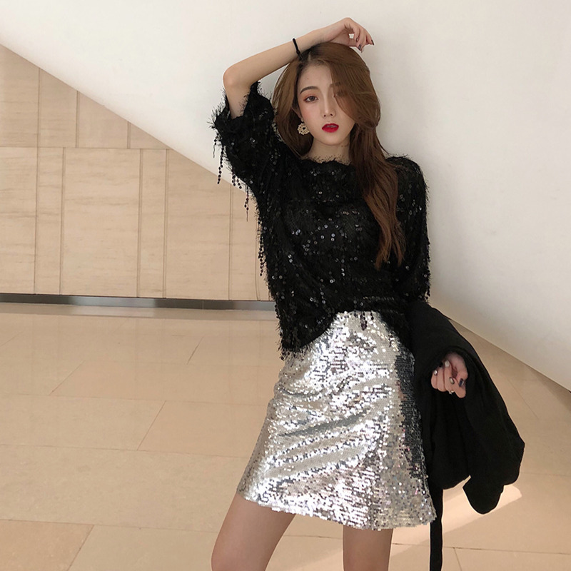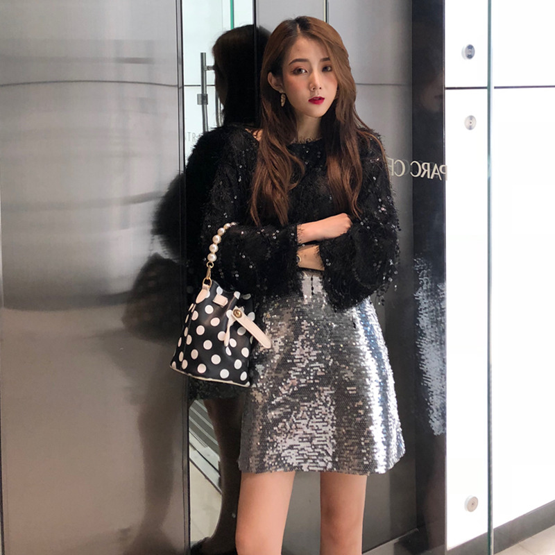 2018秋裝新款韓版兩件套女氣質重工流蘇亮片上衣珠片短裙時尚套裝