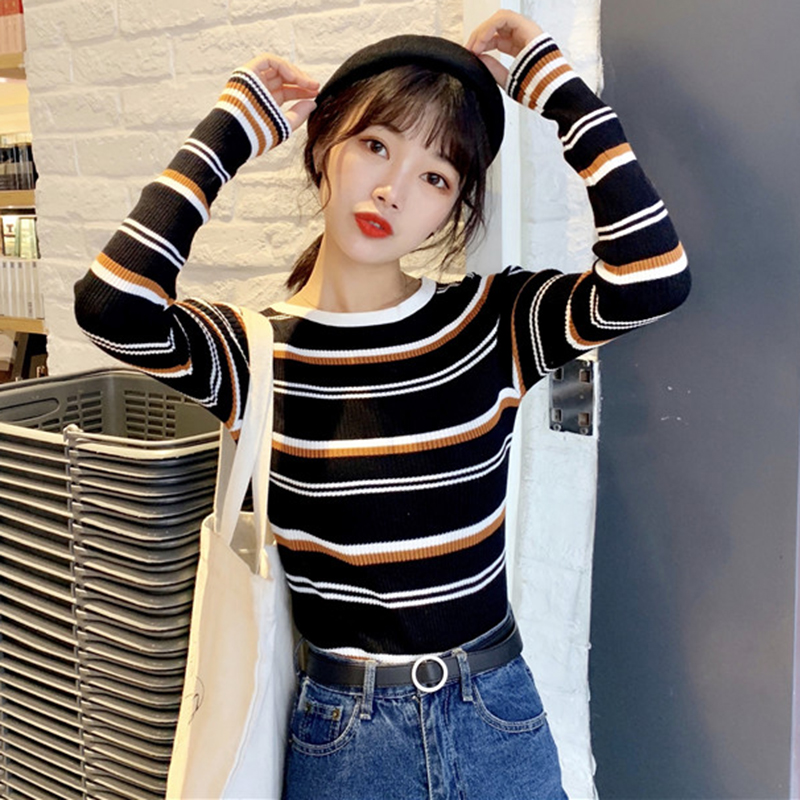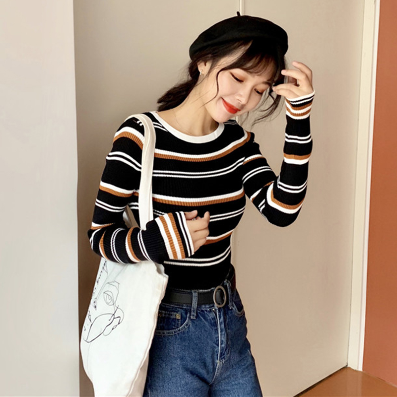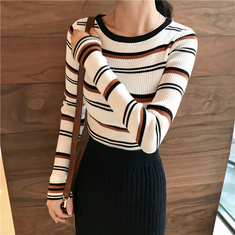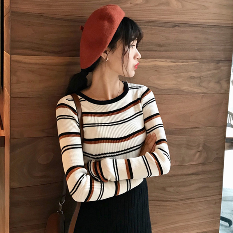 條紋針織衫女秋冬裝2018新款韓版氣質修身顯瘦圓領長袖打底薄毛衣