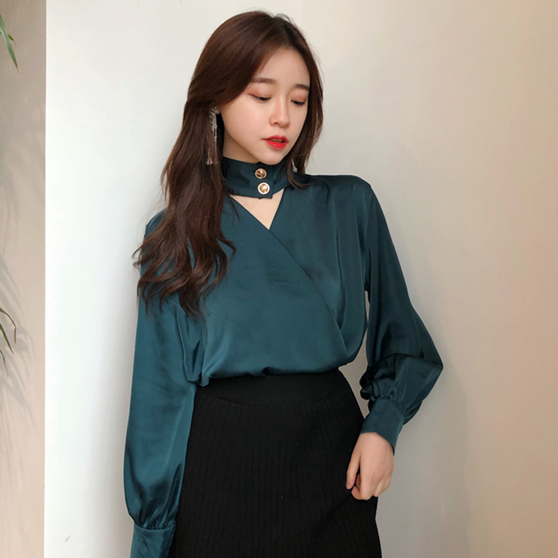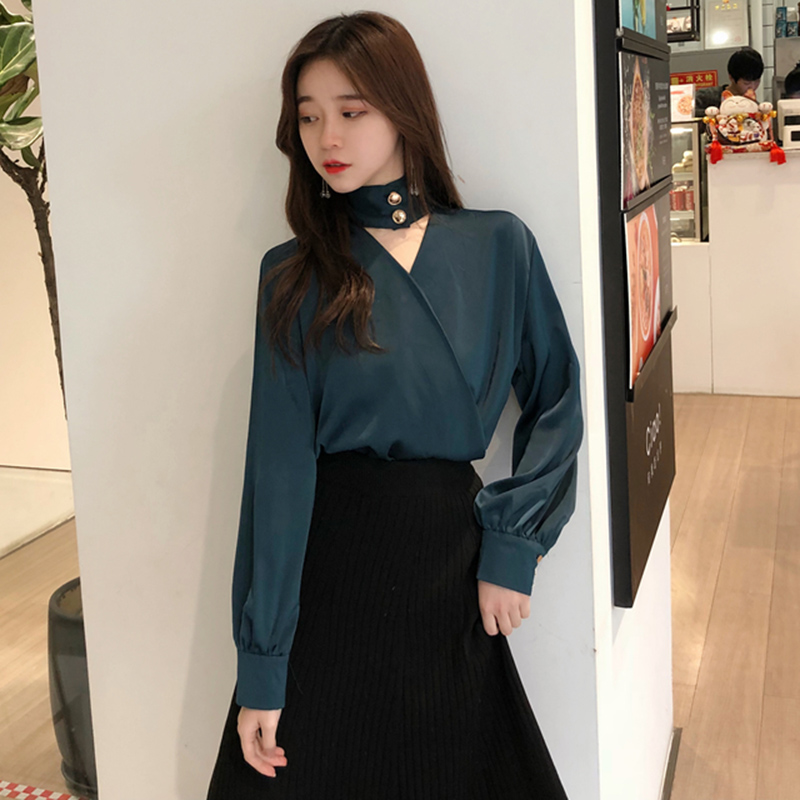 / 溫柔風氣質長袖襯衫女秋裝新款寬松上衣港味復古掛脖V領鏤空襯衣