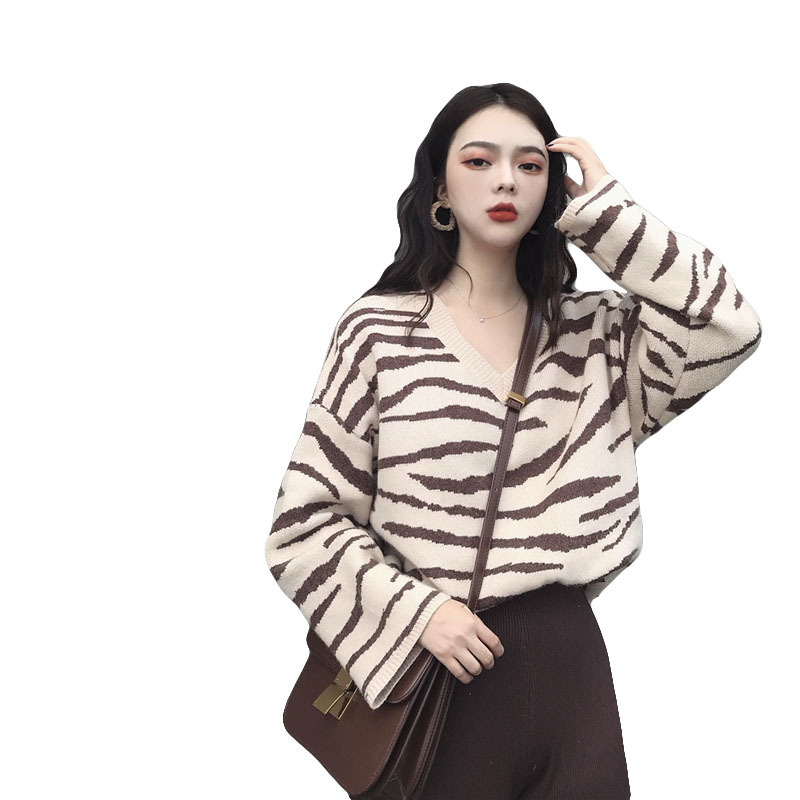 chic慵懶風網紅毛衣女2018新款寬松百搭虎紋氣質套頭V領針織衫潮