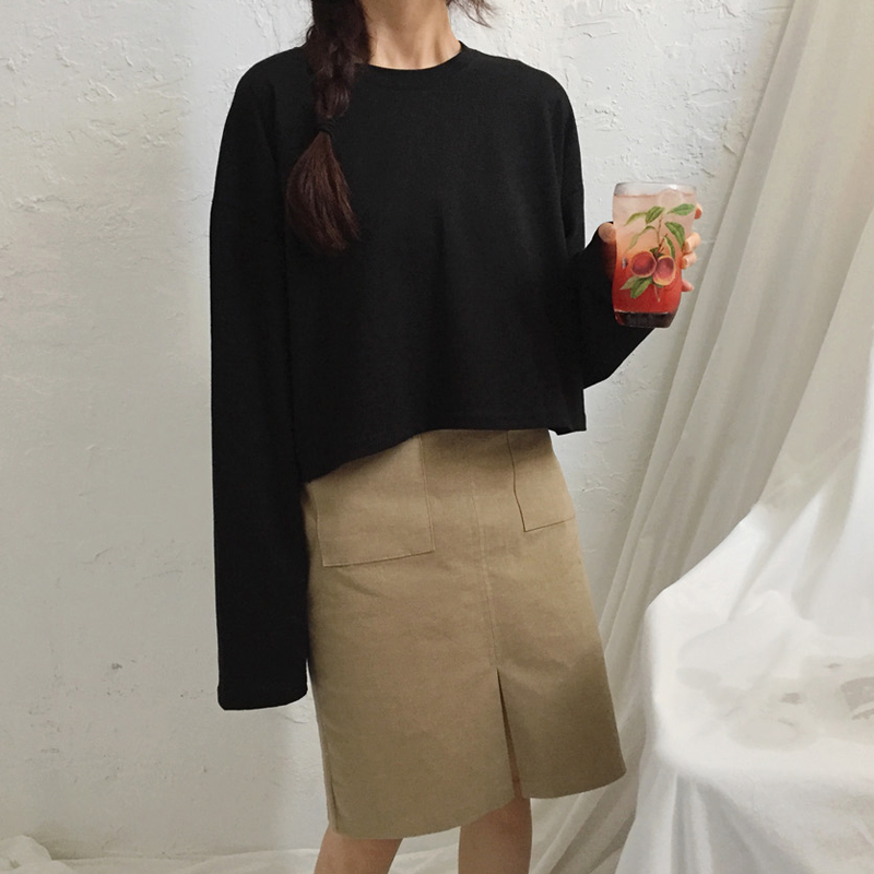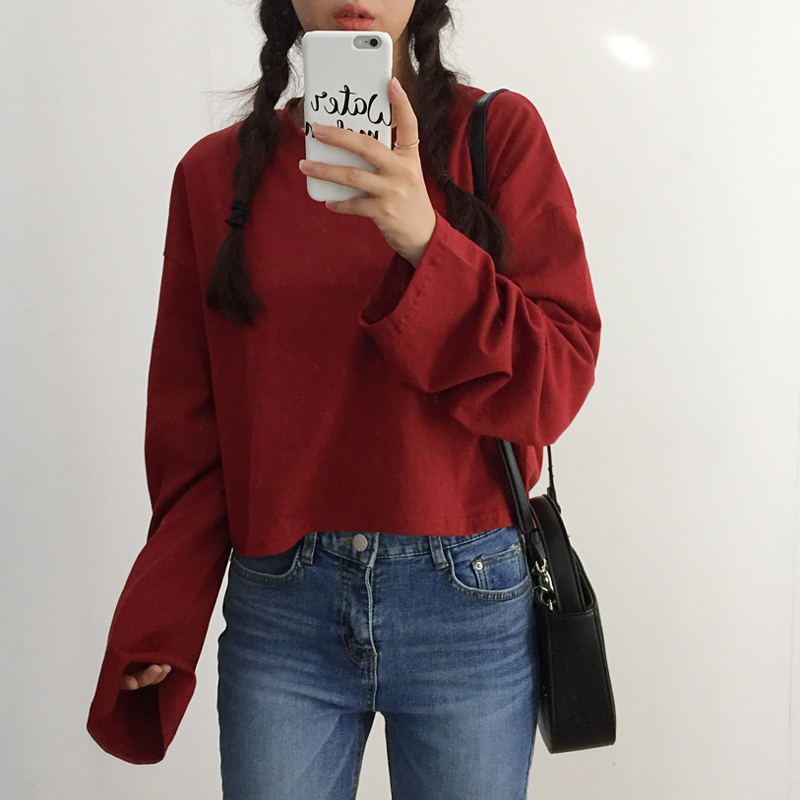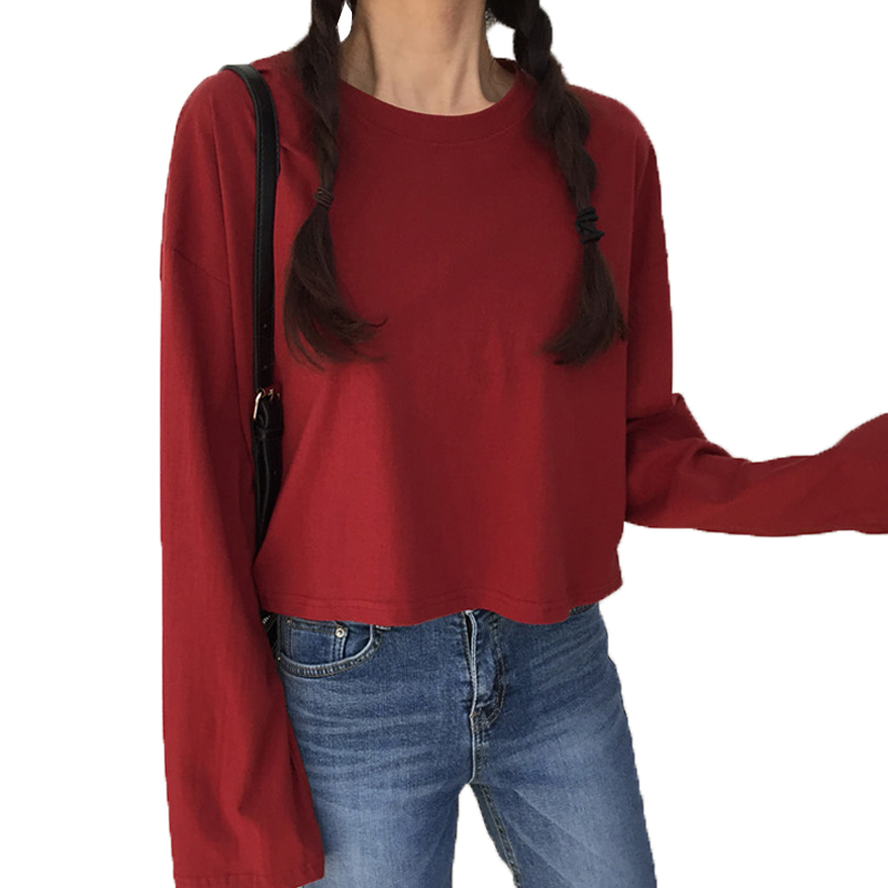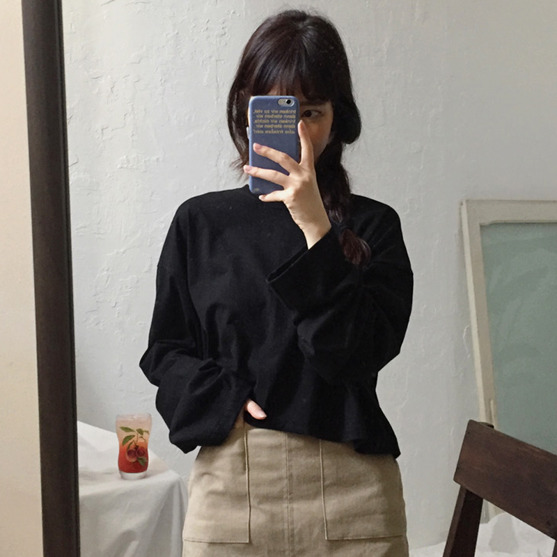 / 秋裝女裝新款韓版寬松百搭短款長袖純色T恤露臍上衣打底衫學生潮