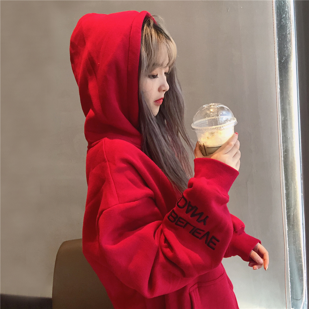 2018新款秋冬韓版字母刺繡加絨中長款BF風寬松連帽超火衛衣外套女