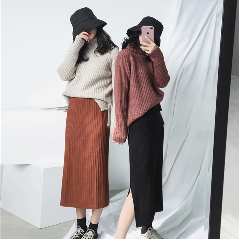 秋裝女2018新款韓版學生高腰開叉針織半身裙時尚港味黑色中長裙子