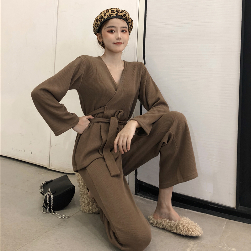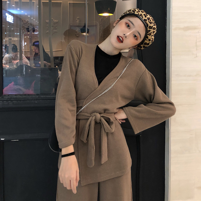 套裝女秋新款系帶長袖針織開衫高腰顯瘦休閑寬松闊腿長褲子兩件套