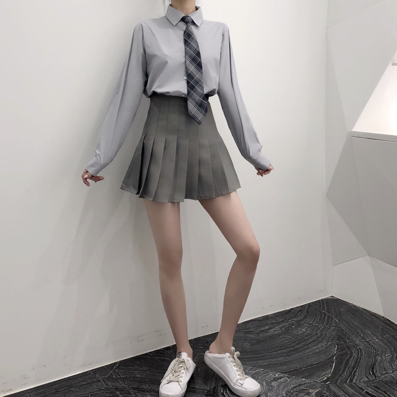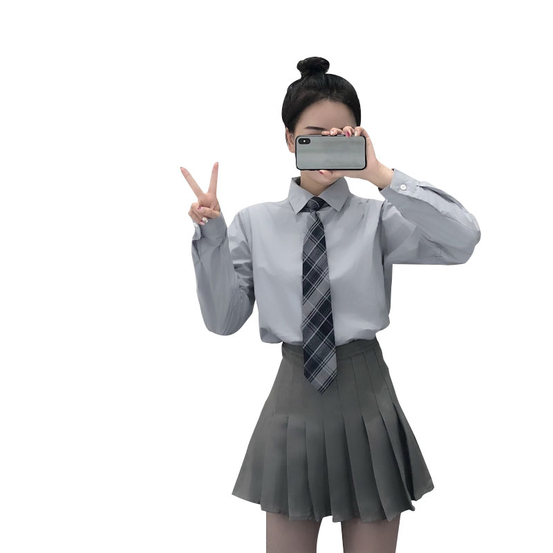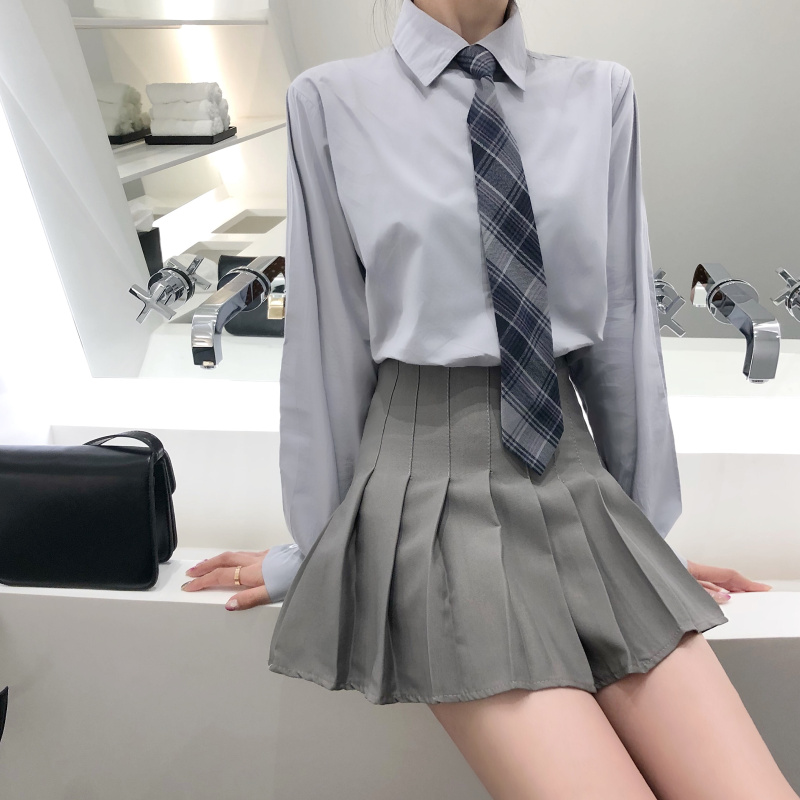 韓國學院風寬松長袖襯衫+格紋領帶+百褶高腰半身裙時尚套裝分開拍