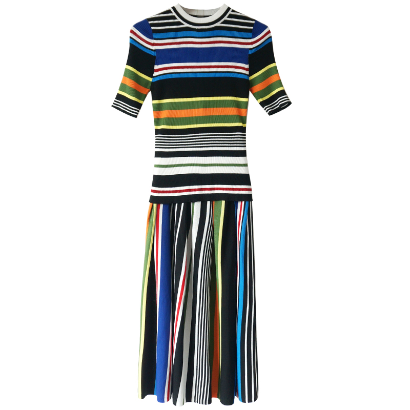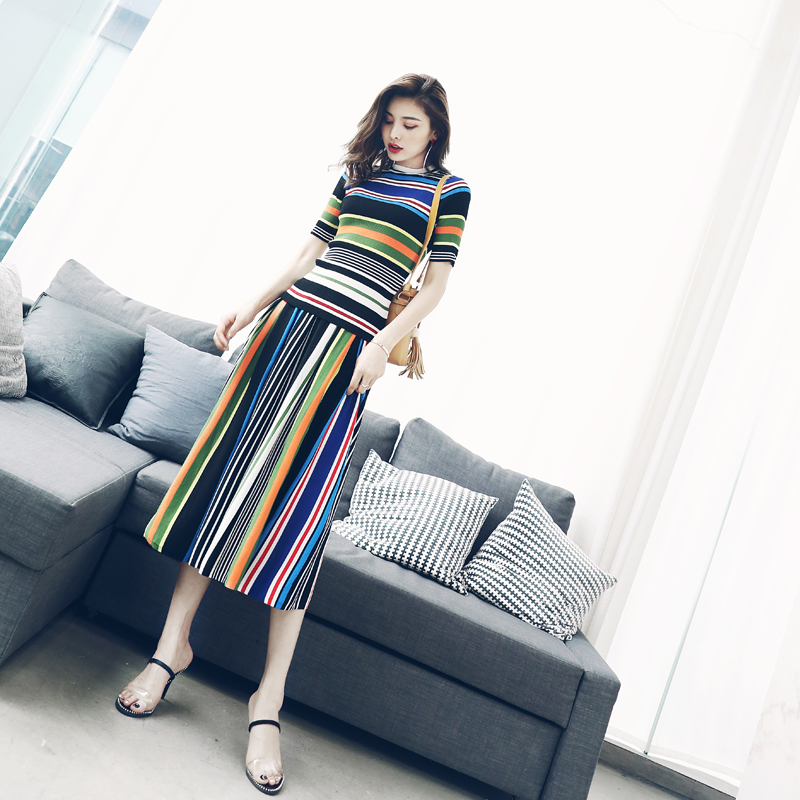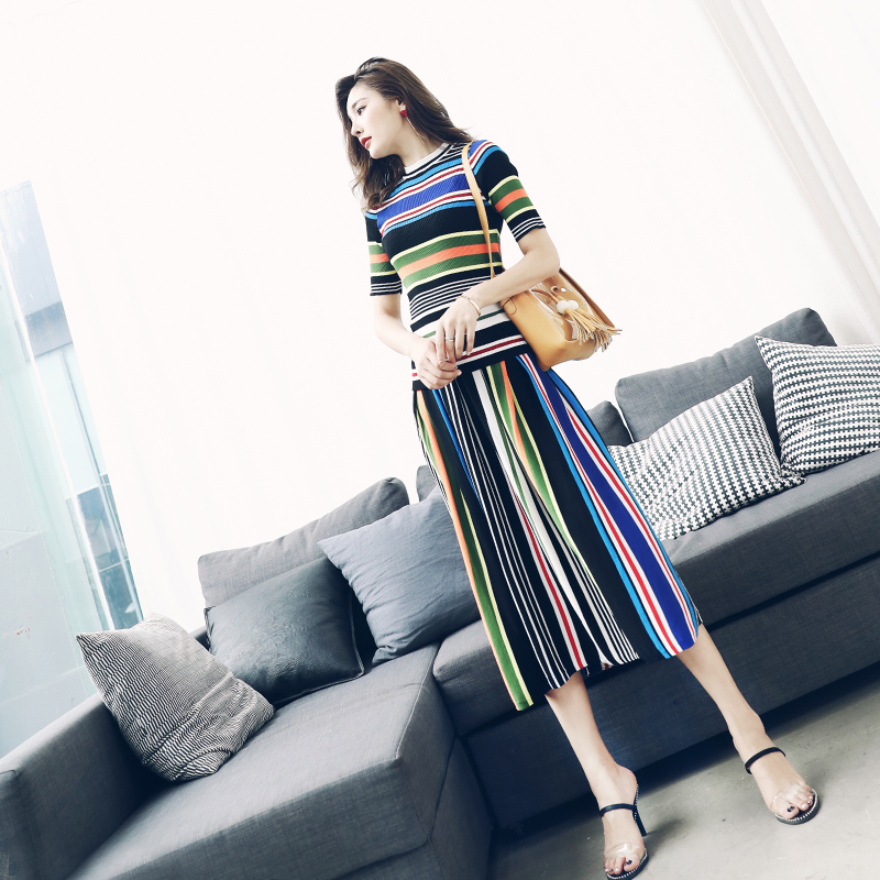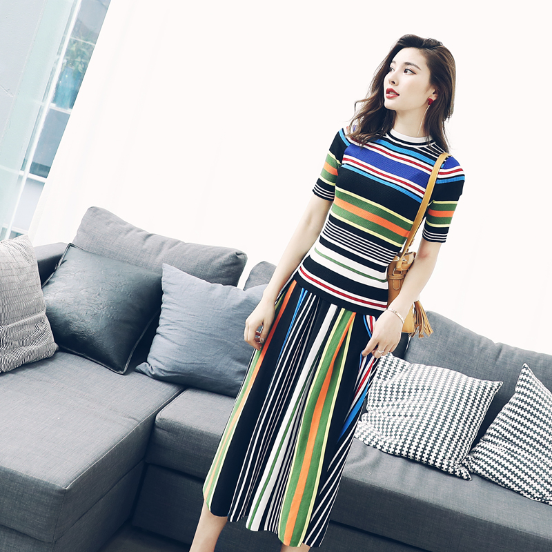 / 淑女chic名媛套裝女裝夏季2018新款條紋針織上衣裙子半身裙兩件套