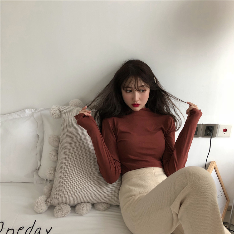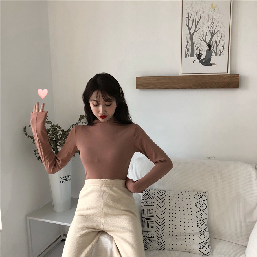 初秋新款女上衣韓版時尚chic基礎款百搭顯瘦高領純色打底衫t恤女