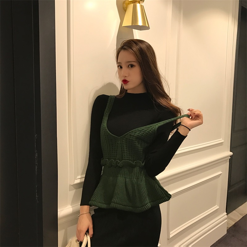 / 韓版氣質半高領修身毛衣女秋冬2018新款+針織吊帶背心女時尚套裝
