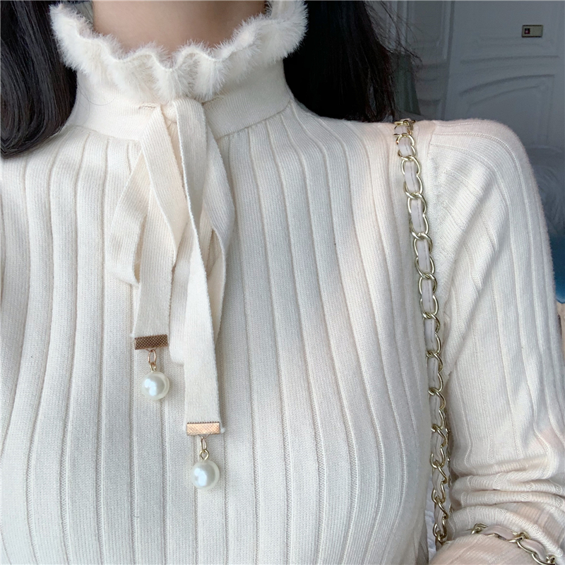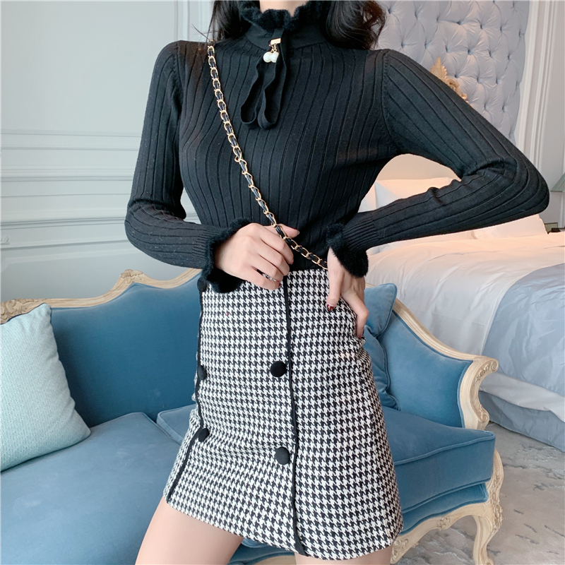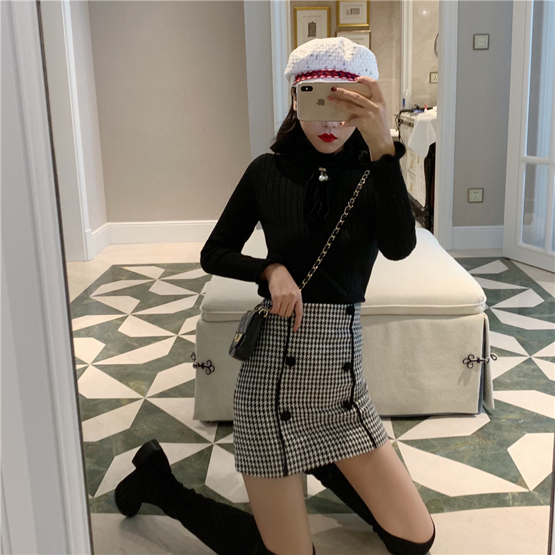 秋冬修身木耳邊系帶針織衫高腰千鳥格毛呢包臀短裙時尚套裝兩件套