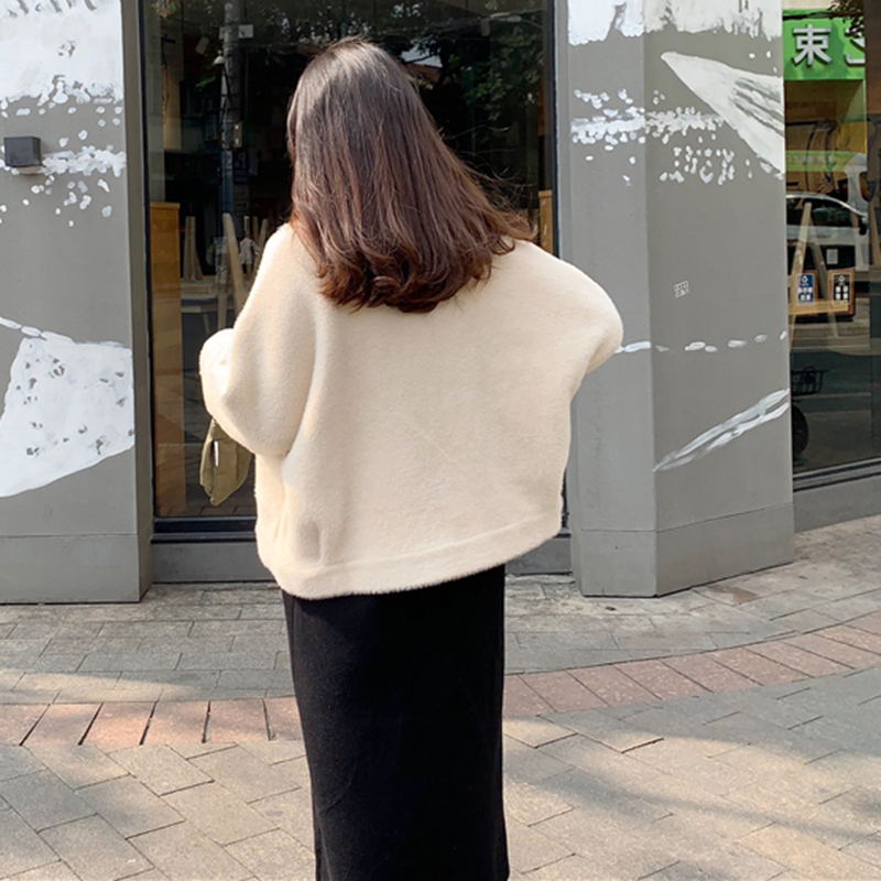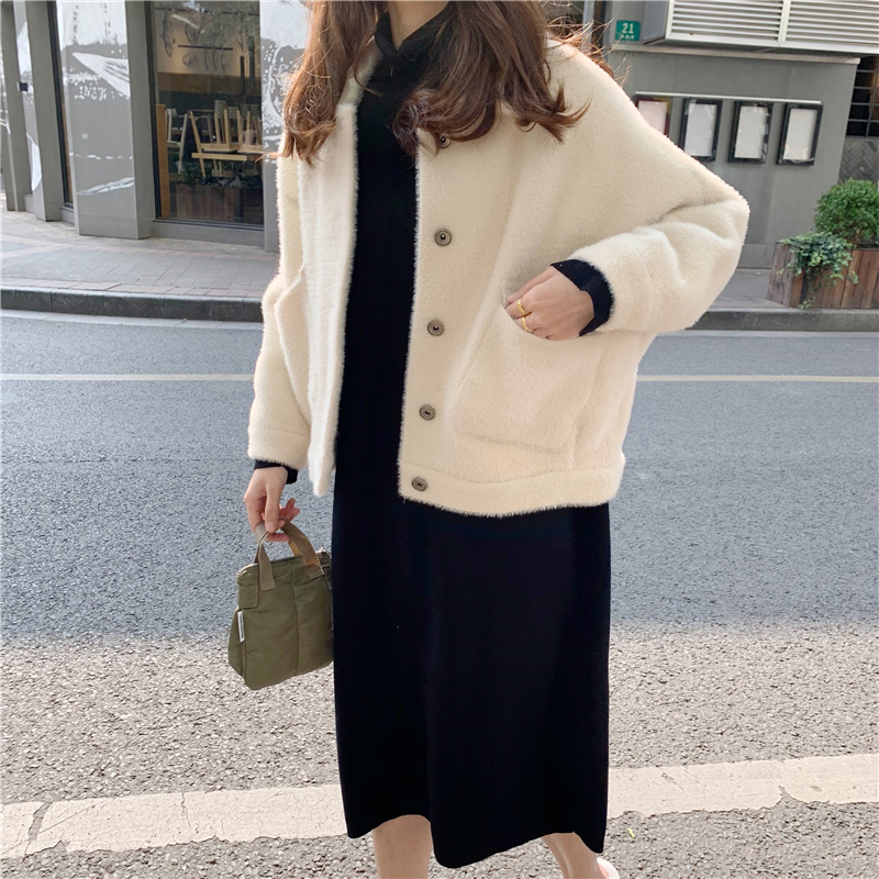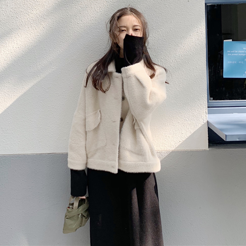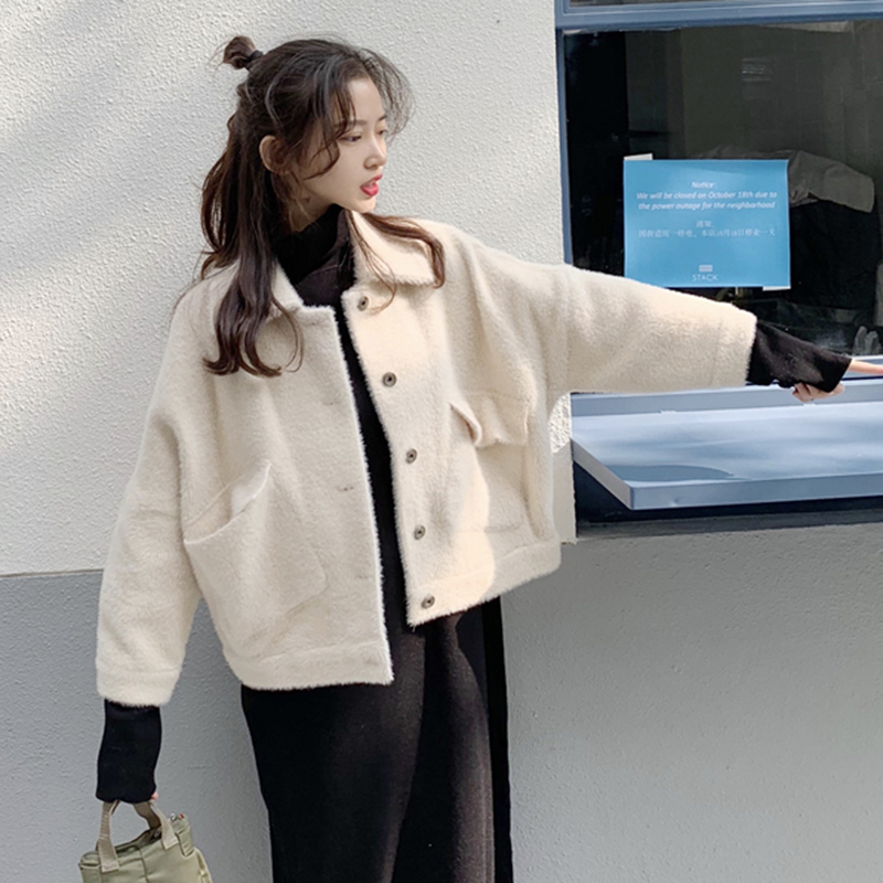 / 休閑口袋純色毛絨短外套女秋冬裝新款學院風翻領寬松長袖開衫上衣