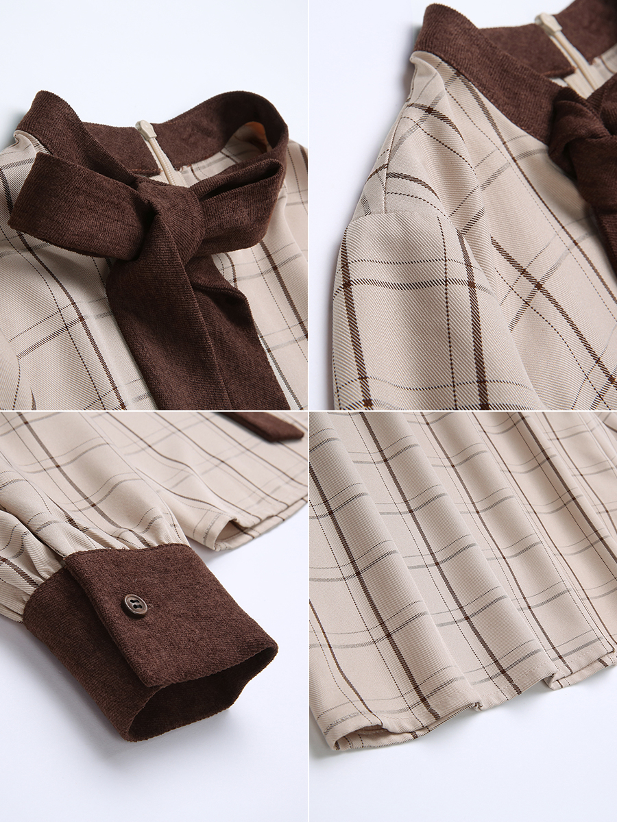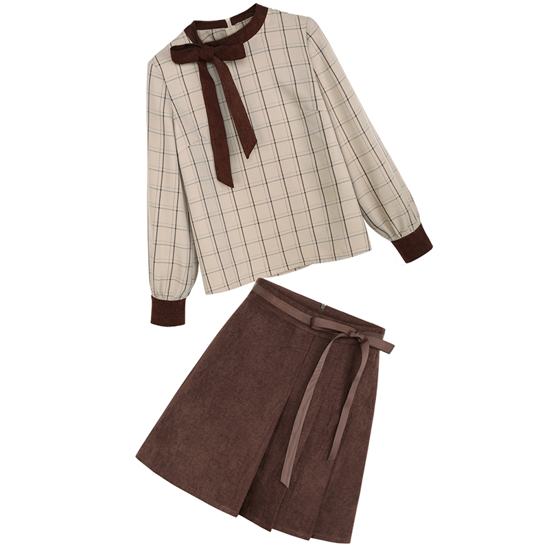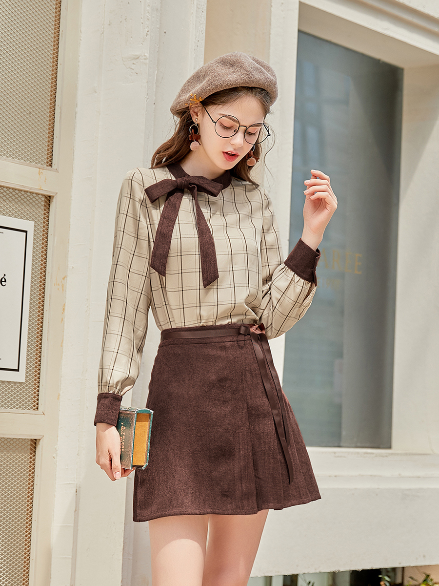 MG小象長袖格子襯衫女秋2018新款時尚高腰半身裙蝴蝶結chic上衣潮
