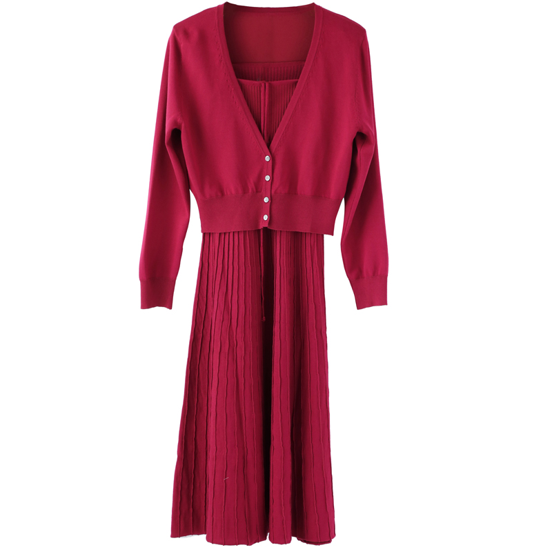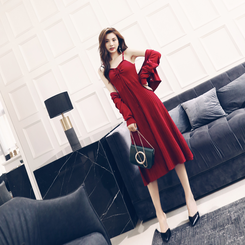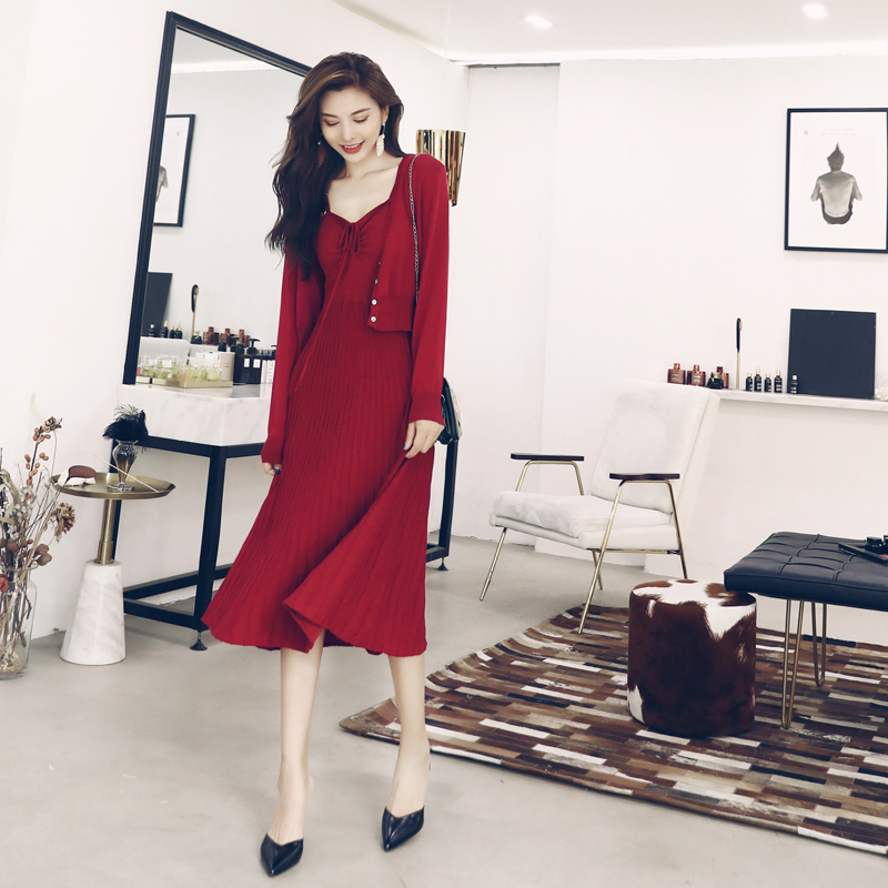 針織開衫吊帶連衣裙女兩件套2018秋冬新款時尚氣質寬松小心機套裝