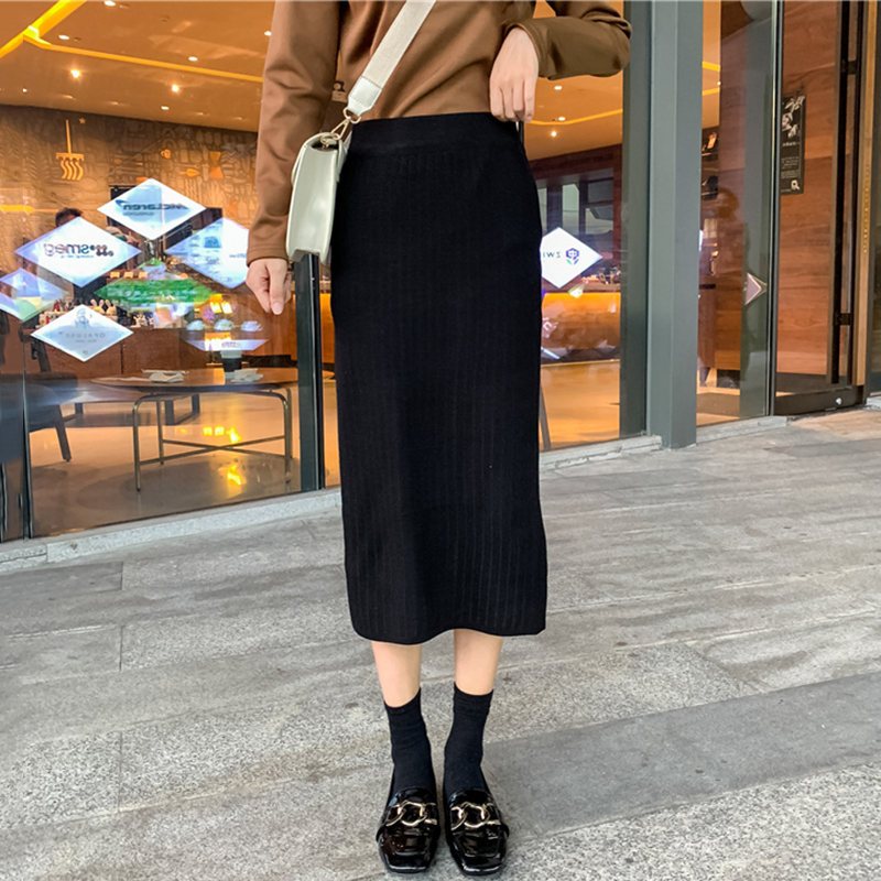 中長款開叉一步裙女冬裝2018新款韓版高腰顯瘦A字裙針織半身裙子