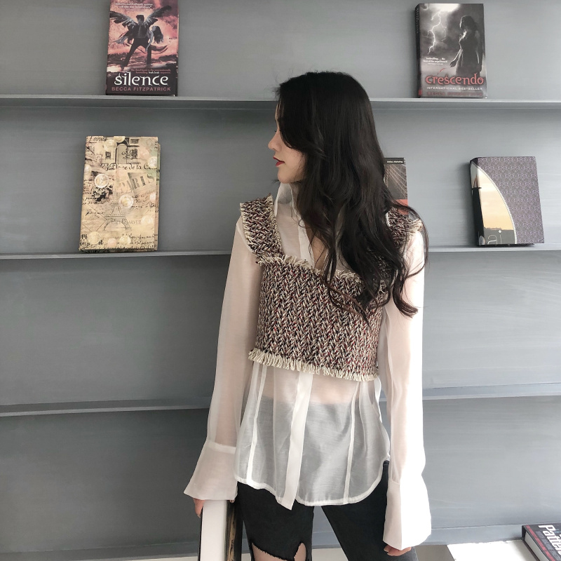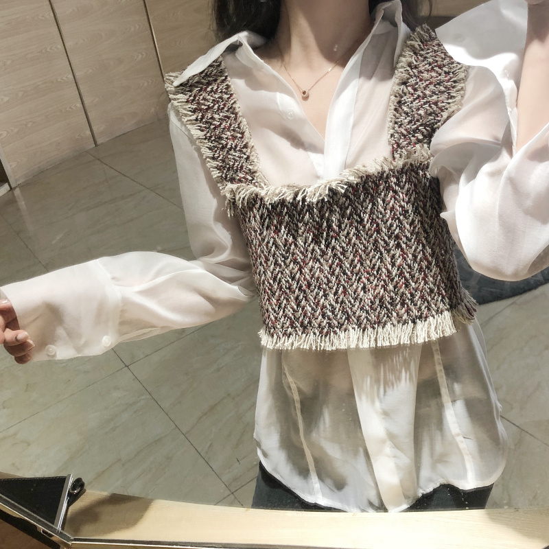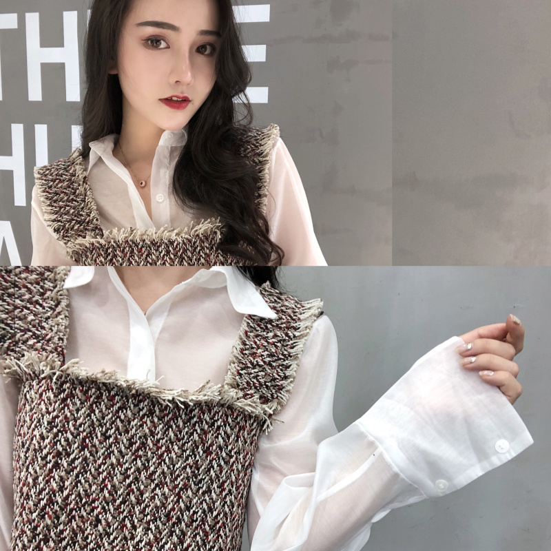韓版chic2018新款毛邊短款吊帶+透視長袖襯衫兩件套女小香套裝潮