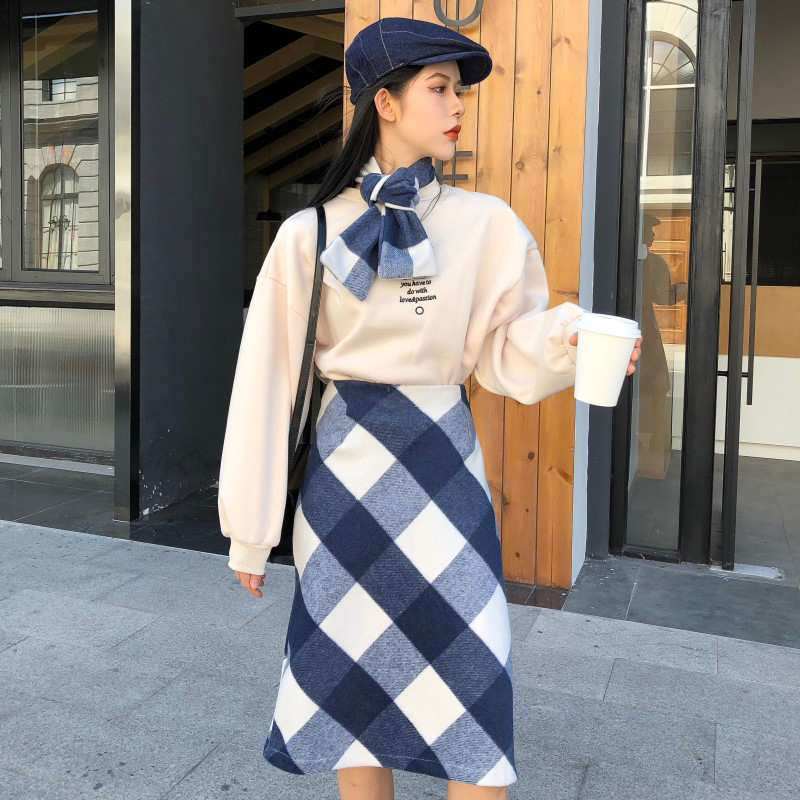 女神套裝2018秋冬新款寬松字母刺繡長袖衛衣高腰顯瘦毛呢半身裙子