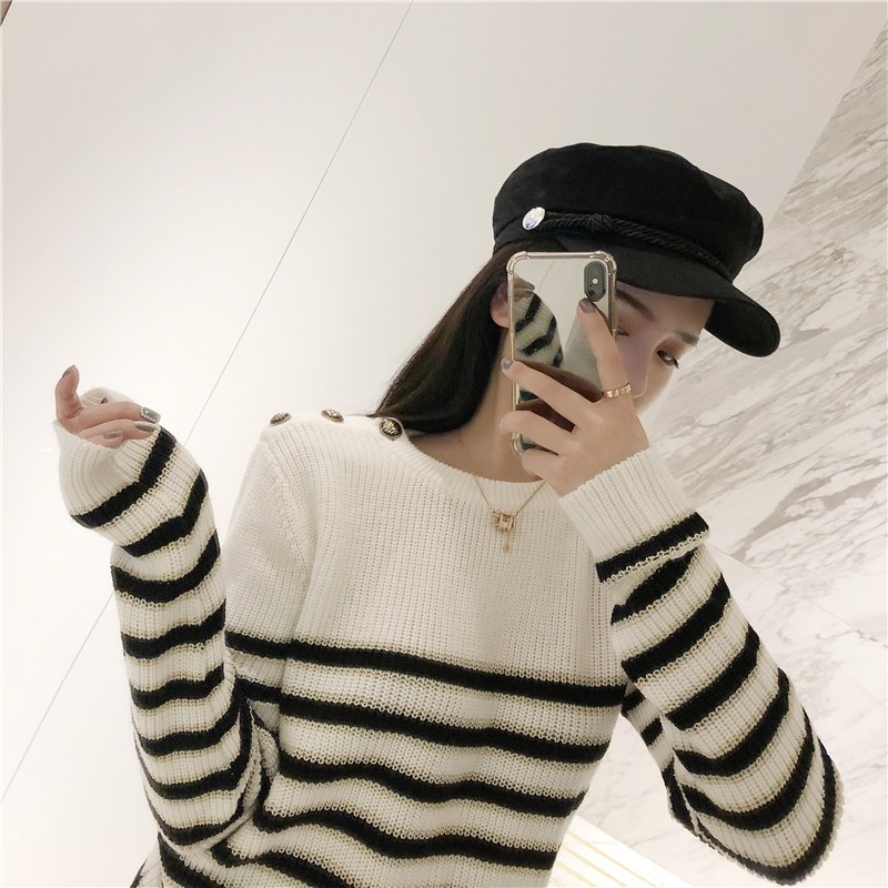 / 慵懶風套頭毛衣女2018新款秋冬金屬扣中長款條紋毛衣女針織衫上衣