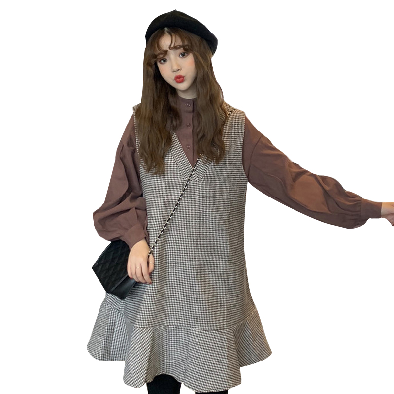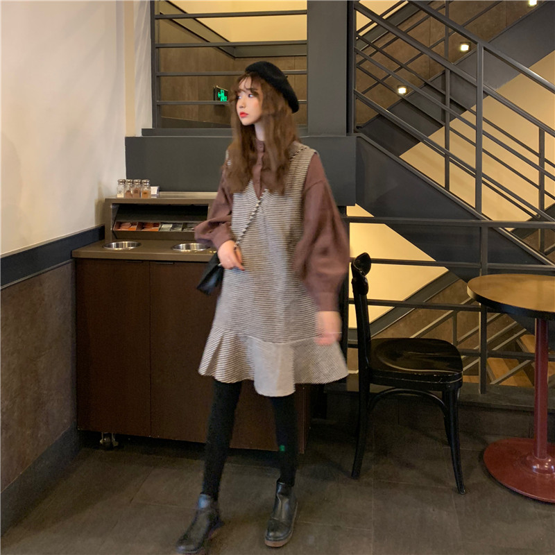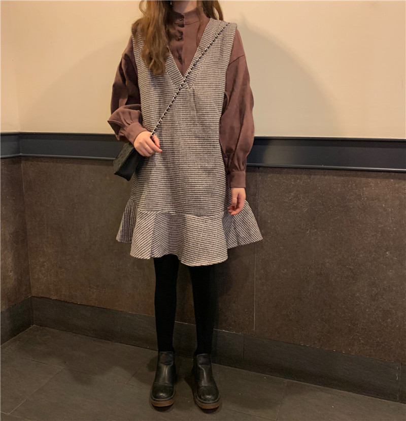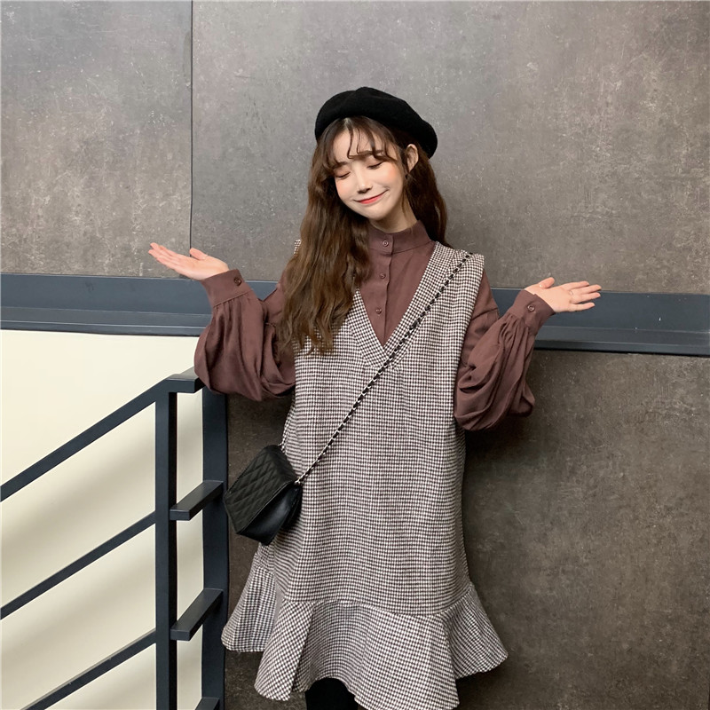 / 韓版時尚休閑套裝秋季女裝V領加厚背心裙連衣裙+燈籠袖襯衫兩件套