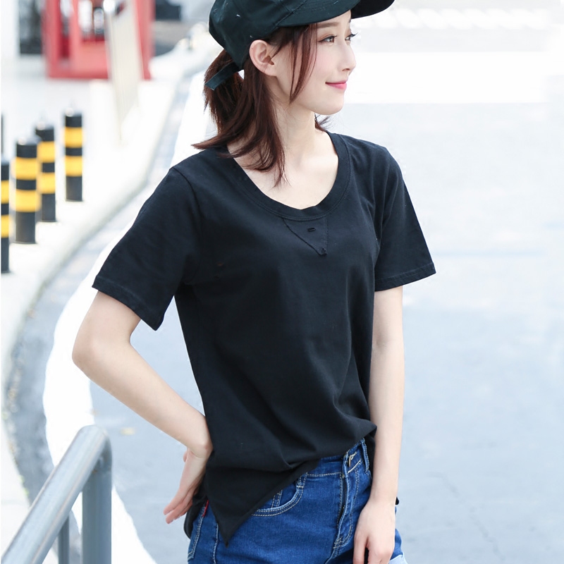 新款純棉短袖T恤女夏寬松顯瘦韓版圓領破洞休閑上衣體恤衫