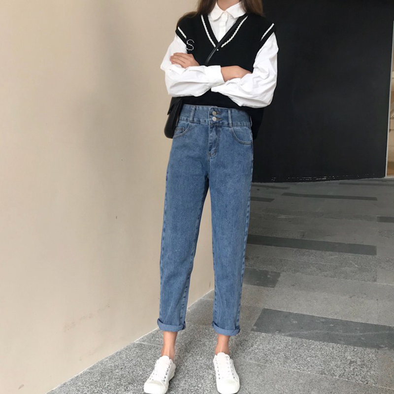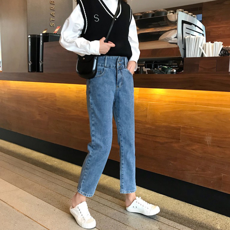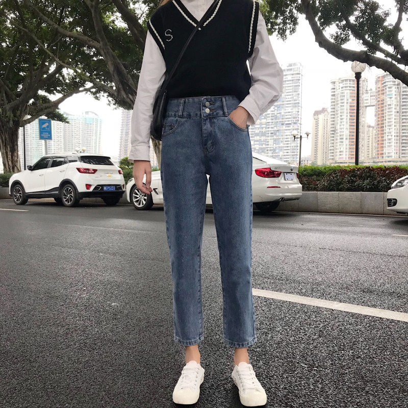 / 復古紐扣高腰顯瘦九分牛仔褲秋冬女裝新款學院風寬松休閑直筒褲子