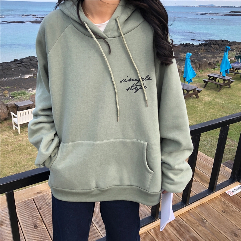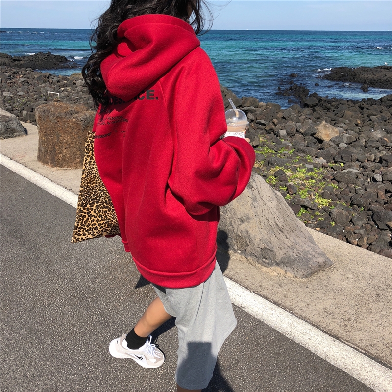 / 秋冬女裝韓版中長款復古寬松連帽慵懶風字母加絨加厚衛衣上衣外套