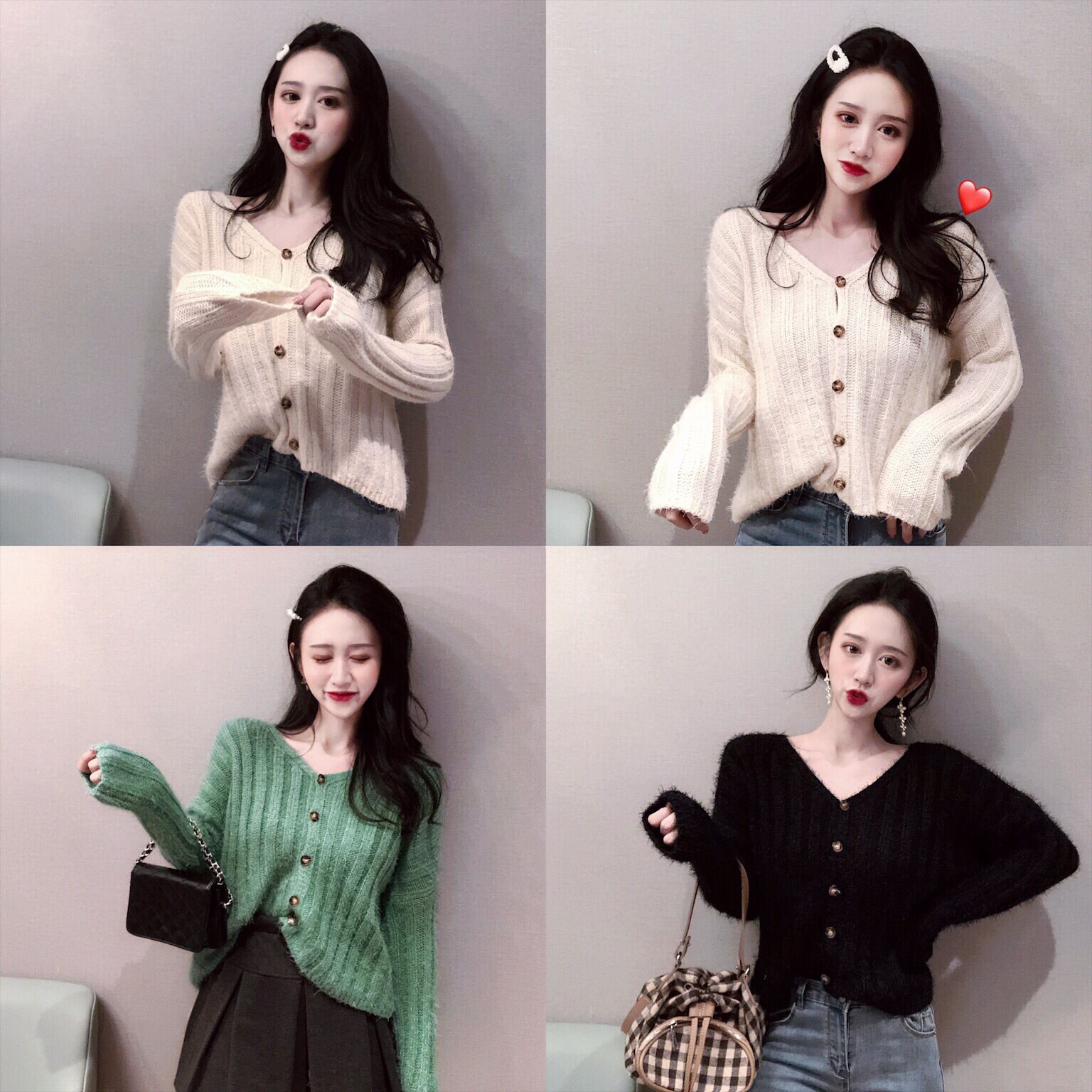 / 韓版慵懶溫柔毛毛坑條V領一排扣純色百搭毛衣女針織開衫短外套潮