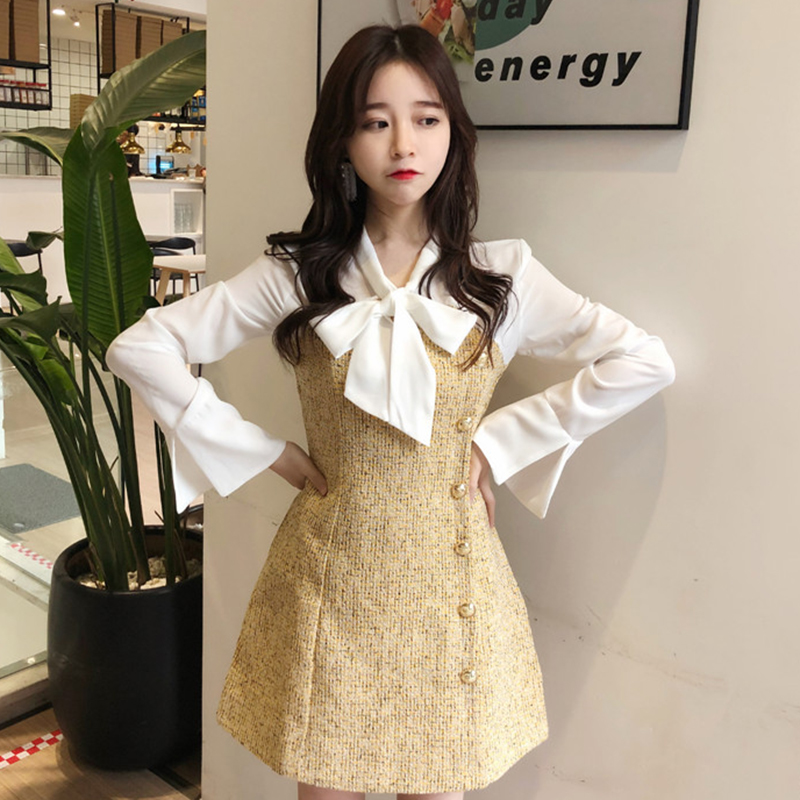 時尚拼接連衣裙女秋冬裝2018新款韓版系帶喇叭長袖毛呢打底a字裙