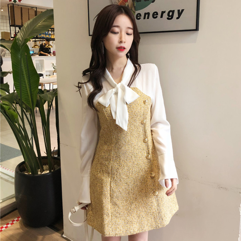 / 時尚拼接連衣裙女秋冬裝2018新款韓版系帶喇叭長袖毛呢打底a字裙