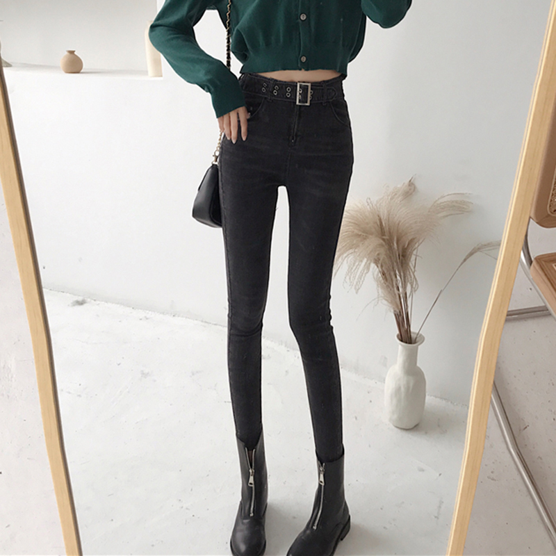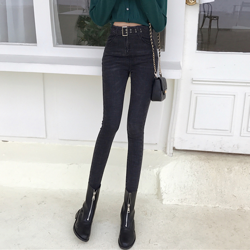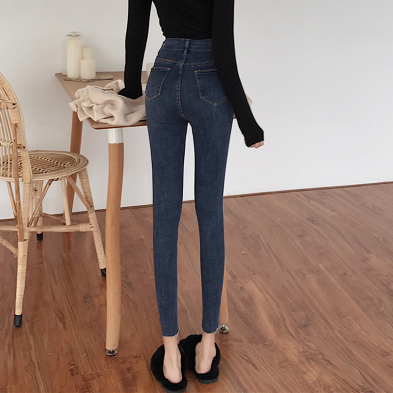 復古風高腰顯瘦緊身牛仔褲女秋冬裝新款學生黑色彈力九分鉛筆褲子