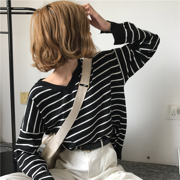 秋裝女裝韓版學院風寬松條紋針織衫開叉長袖套頭顯瘦T恤上衣學生
