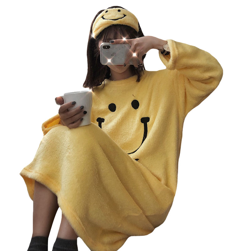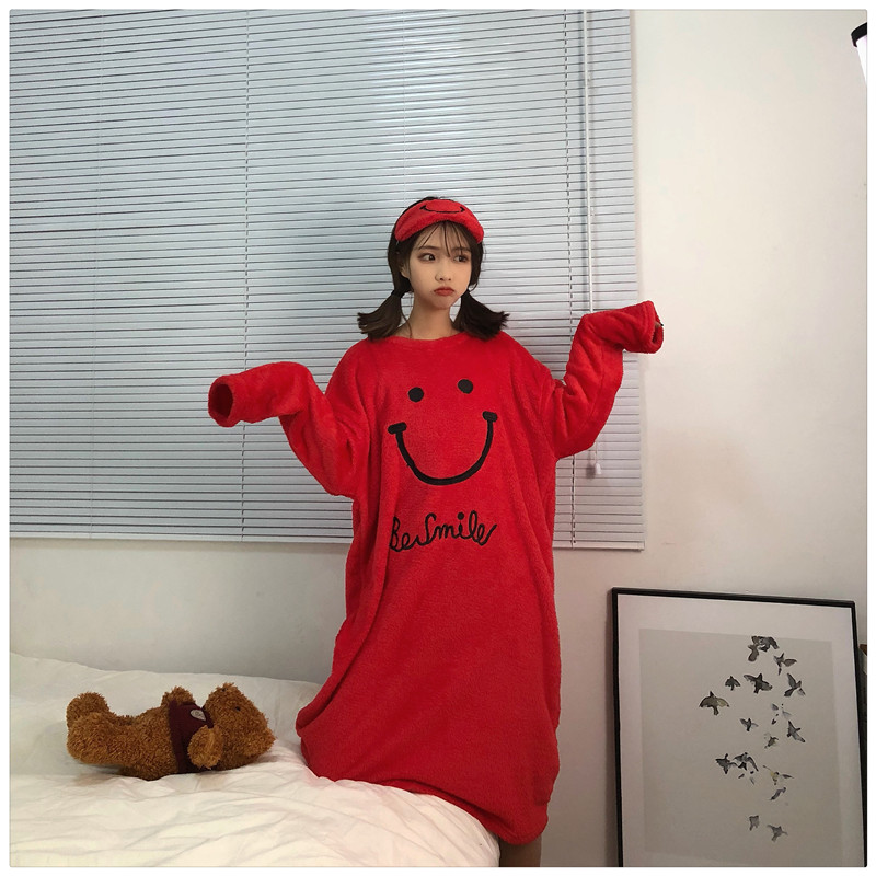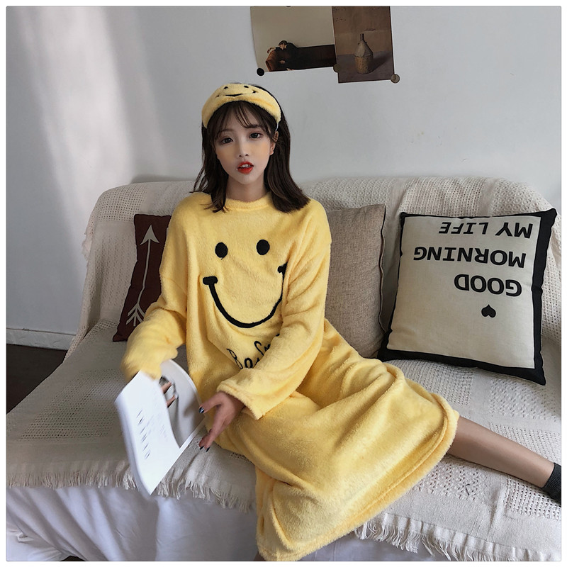 / 秋冬韓版寬松可愛笑臉中長款加厚長袖睡衣連衣裙學生家居服睡裙女