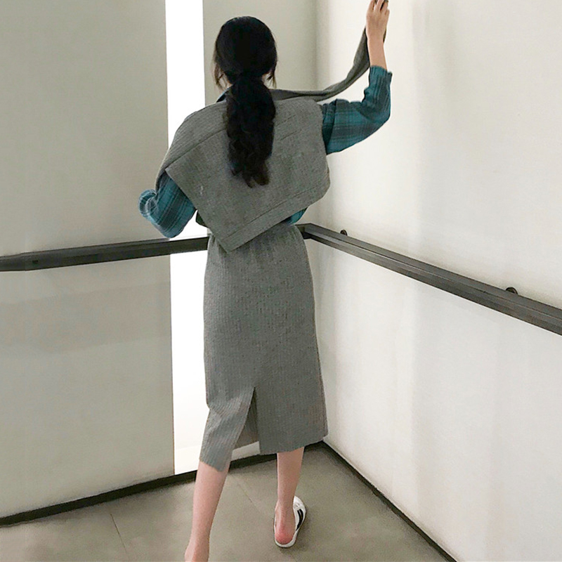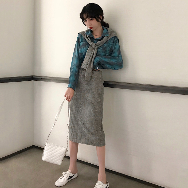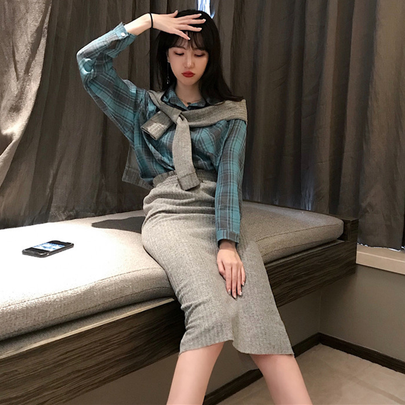 / 秋季2018新款女裝時尚披肩+休閑格子襯衫上衣+包臀針織半身裙套裝