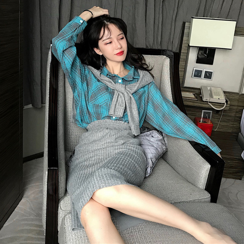 秋季2018新款女裝時尚披肩+休閑格子襯衫上衣+包臀針織半身裙套裝